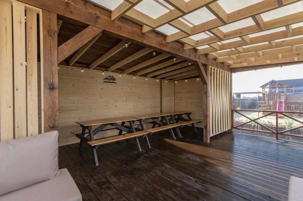 Беседка на 20 человек с освещением, большим столом, диваном и гамаком.