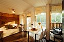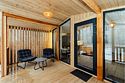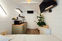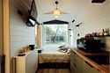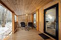 Вместимость домика — один–четыре человека. Размер дома — тридцать квадратных метров. Открытая терраса с уличной мягкой мебелью и с видом на лес — десять квадратных метров.