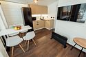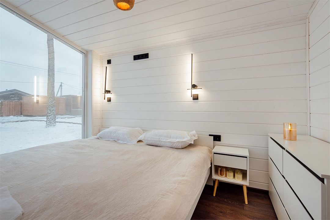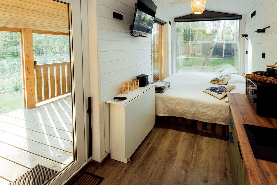 Дом создан для семейного отдыха с комфортным размещением для четырех человек. В доме есть отдельная спальня с большой уютной кроватью и панорамным окном, а в гостиной расположен раскладной диван.