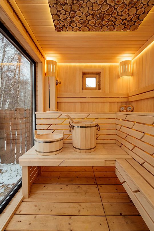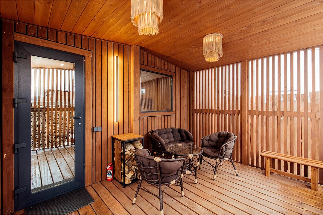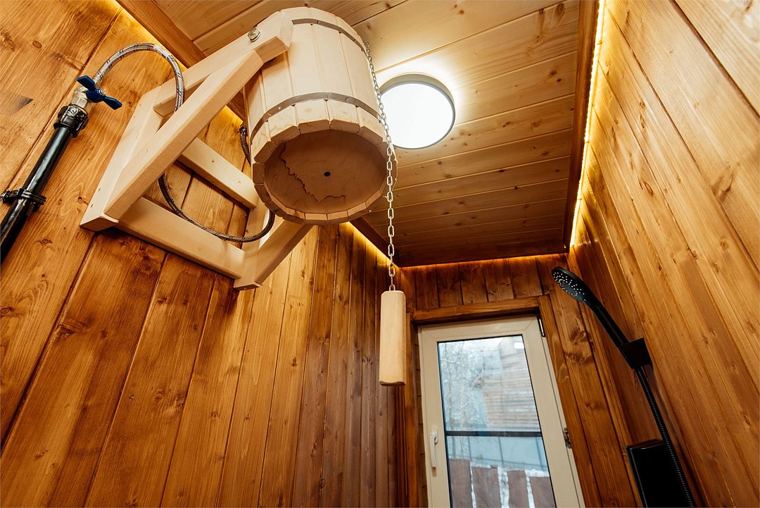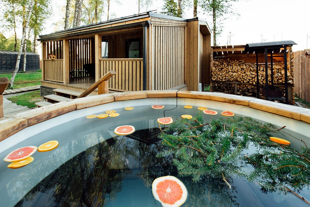 Рядом с каждым домом гостей ожидает изысканная дровяная купель Фурако, где вода, прогретая до 39-40°C, приглашает к неспешному отдыху и релаксации. Здесь можно выбрать между классическими вариантами и более утонченными решениями, обогащенными ароматными травами и натуральными ингредиентами.