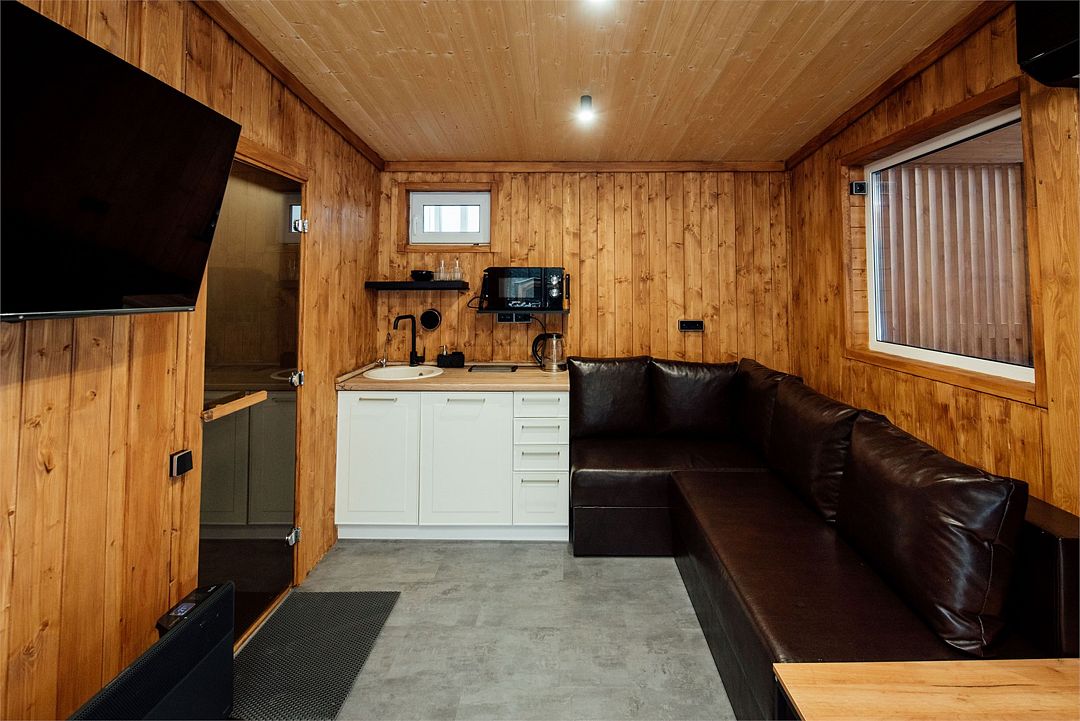 В комнате отдыха есть небольшая кухня и раскладной диван. После парения можно ополоснуть себя ледяной водой из ведра или же окунуться в ледяную купель, которая находится на террасе.