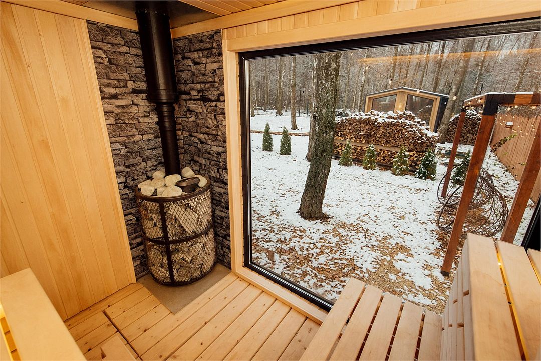 В доме большая кровать и панорамные окна, из которых открывается вид на лес — просыпаешься, и перед глазами чистейшее небо и зелень леса! Также есть кухня с самым необходимым, а на улице расположена мангальная зона, где можно приготовить вкуснейший ужин и наслаждаться им за просмотром любимого сериала.