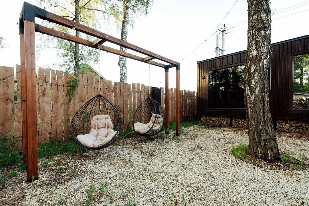 На территории домика есть мягкие подвесные качели, мангальная зона и терраса с мягкой мебелью.