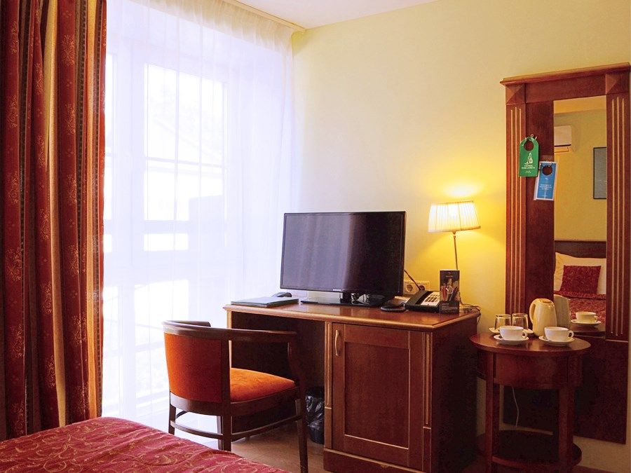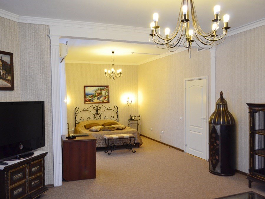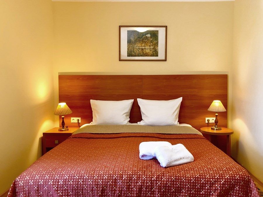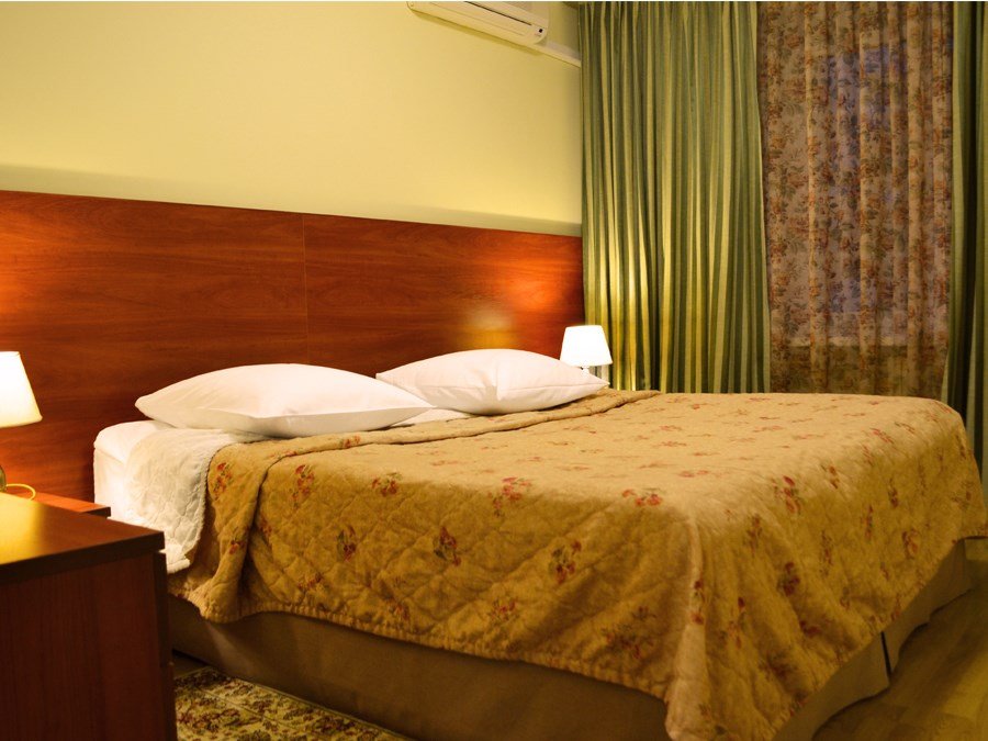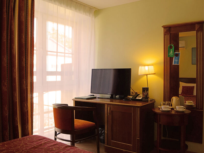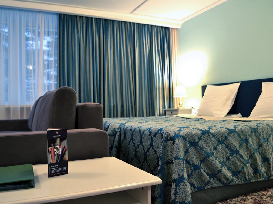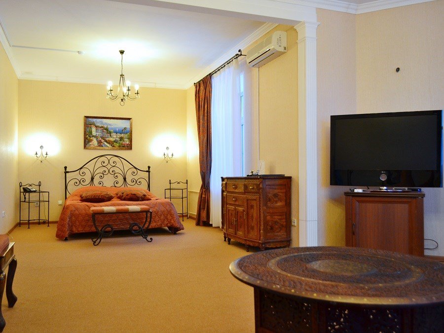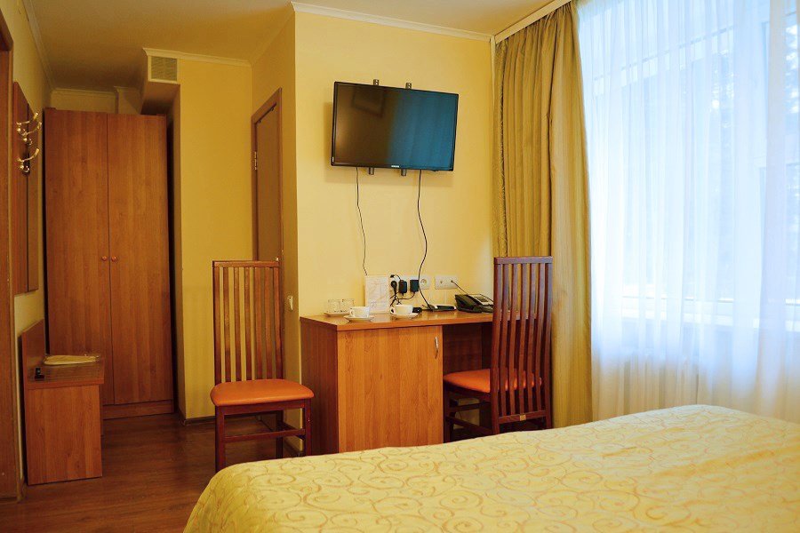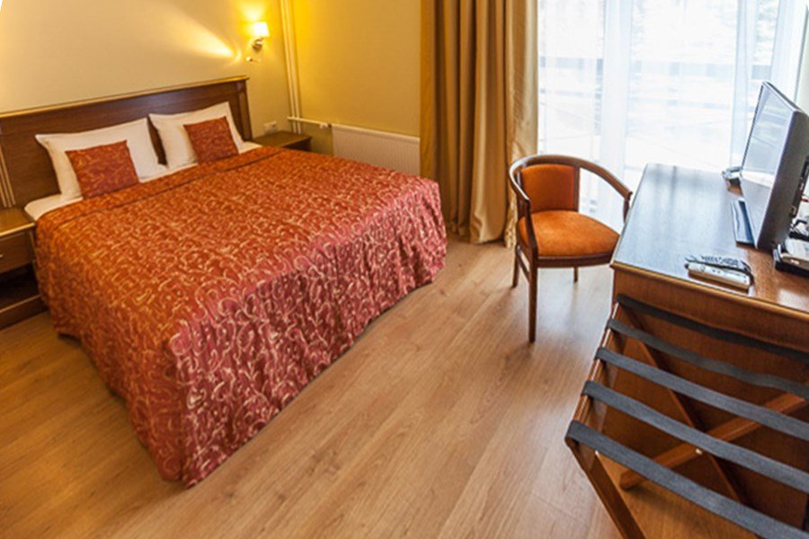 В номере: двуспальная кровать, шкаф, тумба, письменный стол, мини-бар, телевизор, IP-TV, wi-fi.