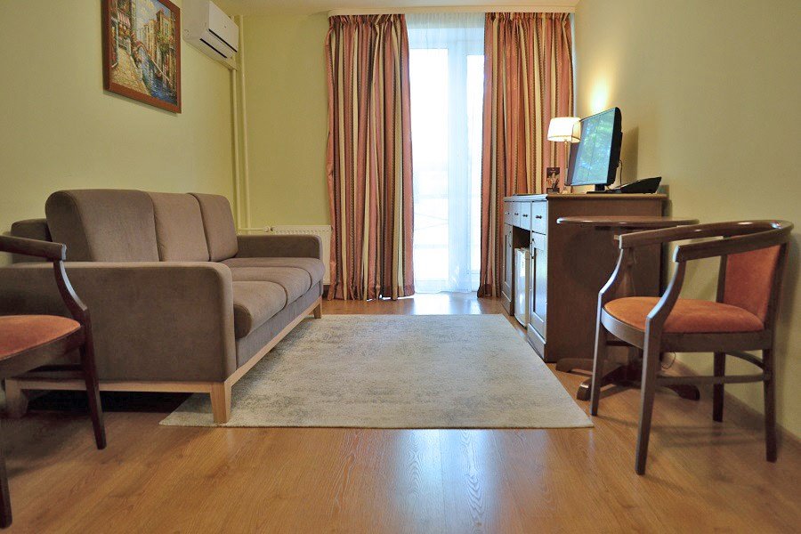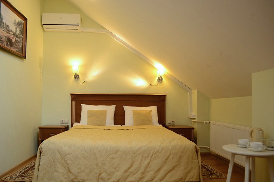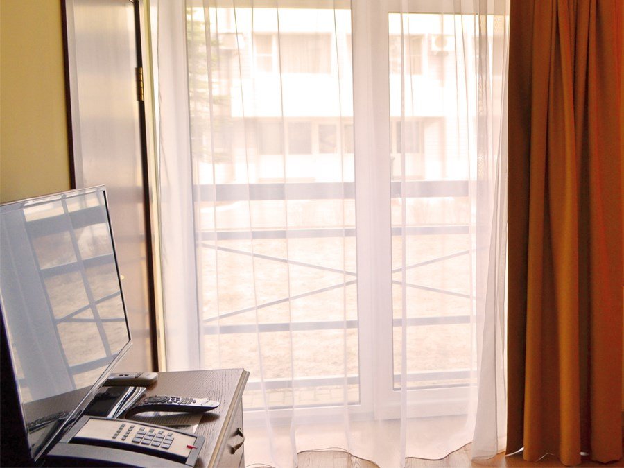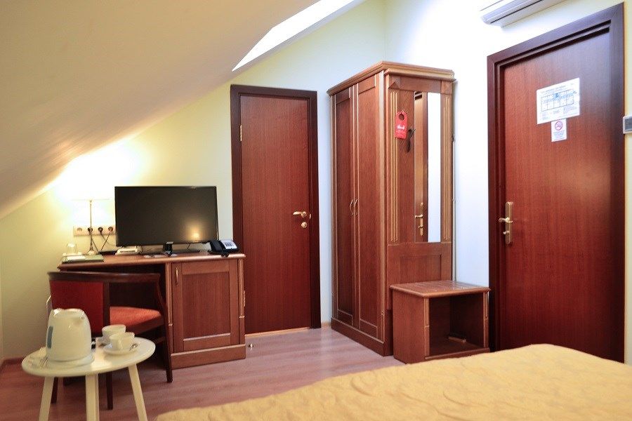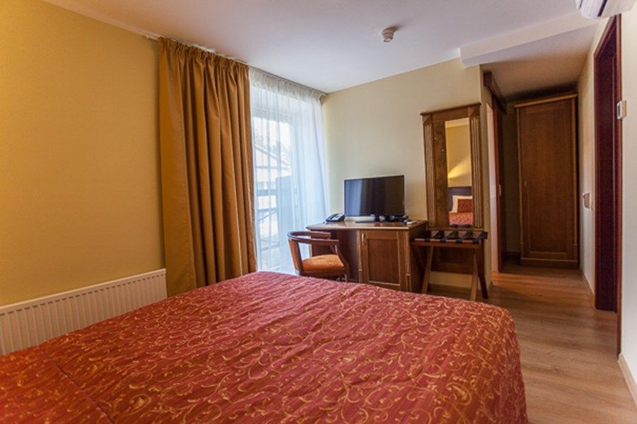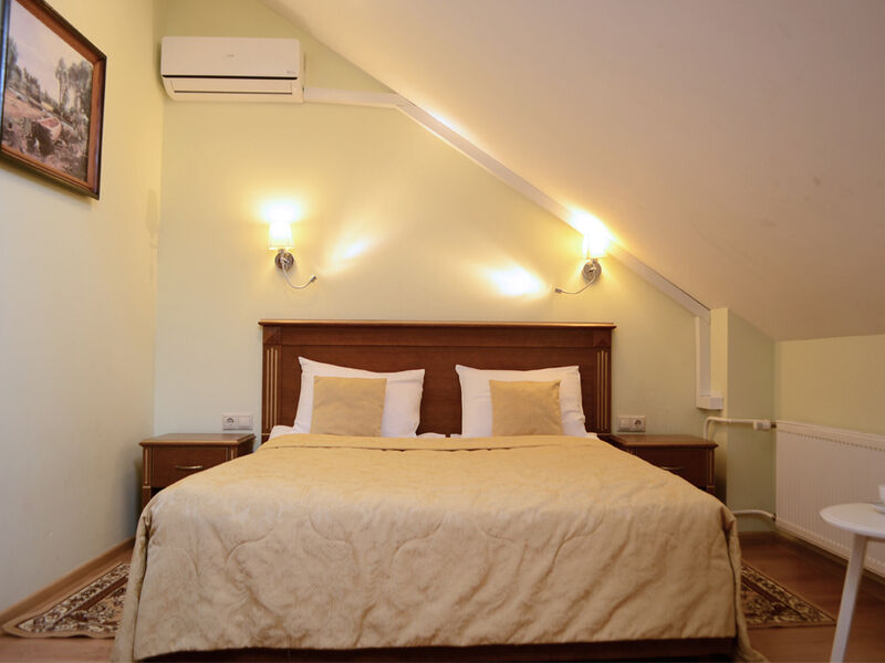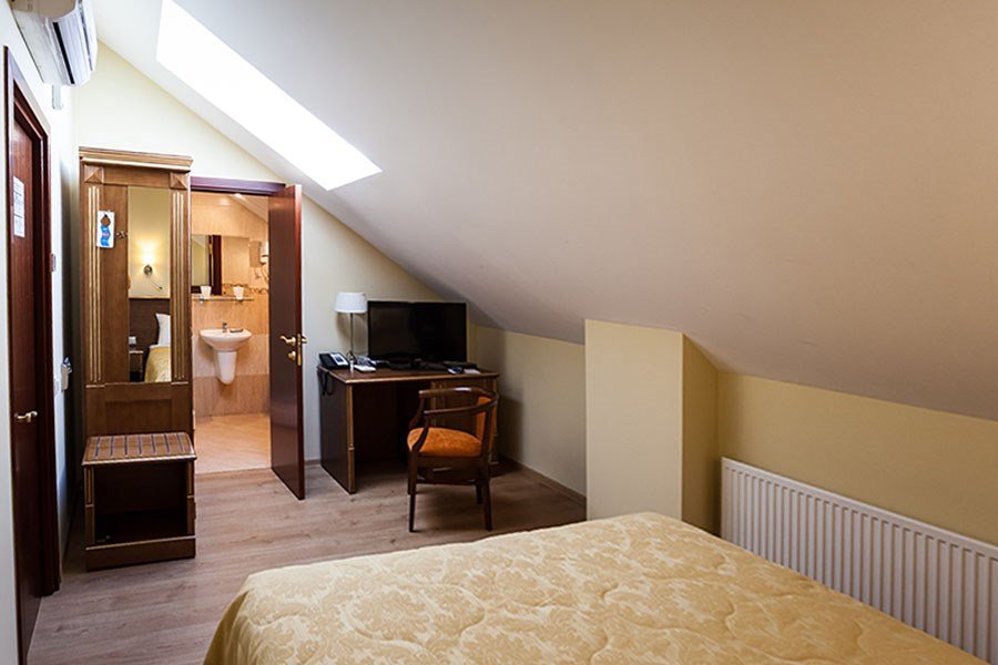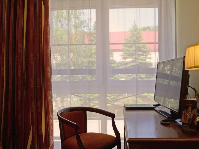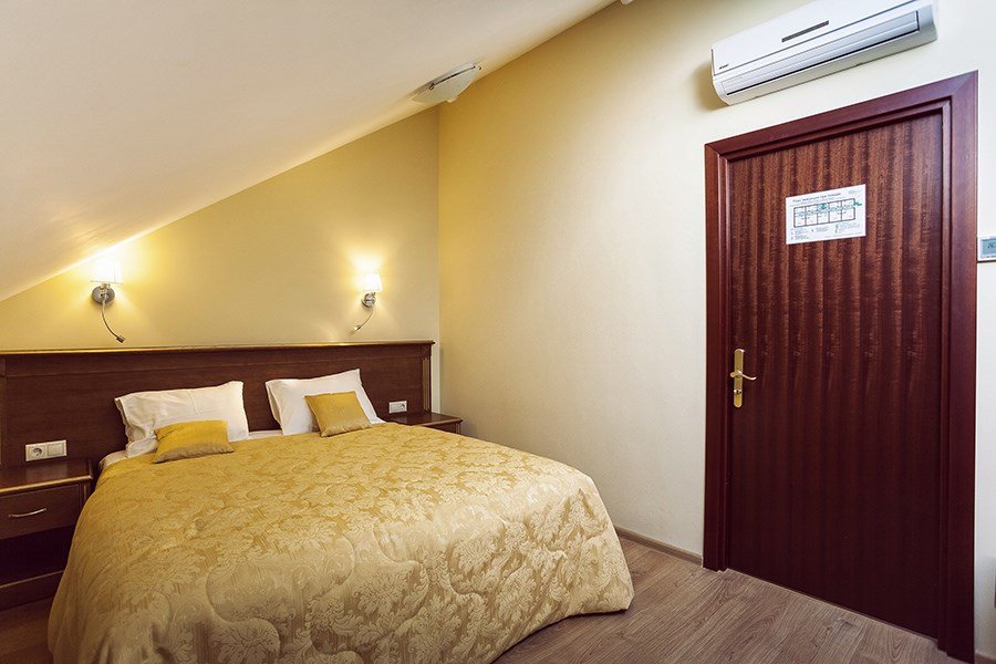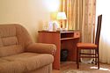 В номере: двуспальная кровать, шкаф, тумба, письменный стол, мини-бар, телевизор, IP-TV, wi-fi.