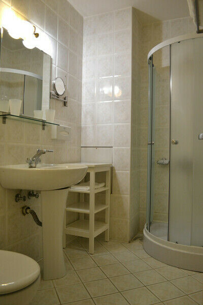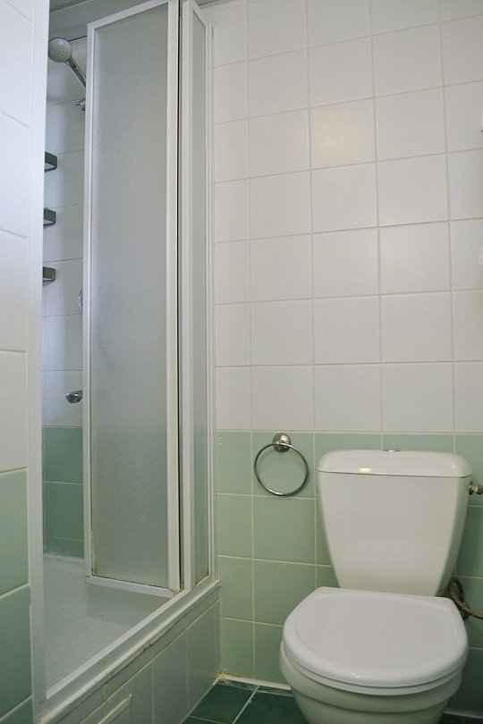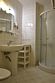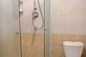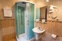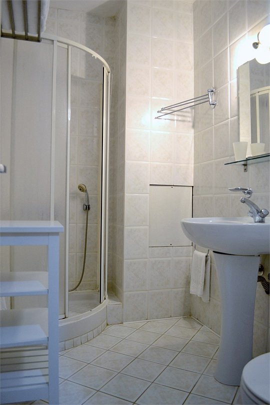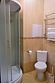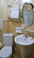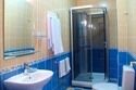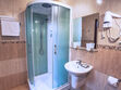 Ванная комната: душ, фен, тапочки, умывальник, туалет.