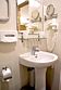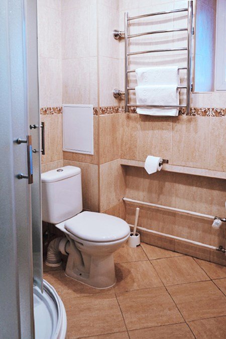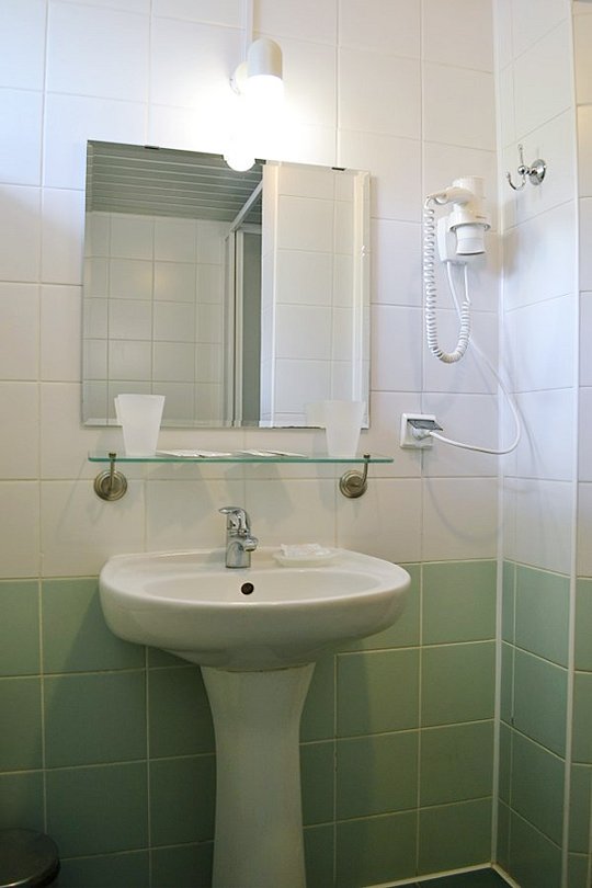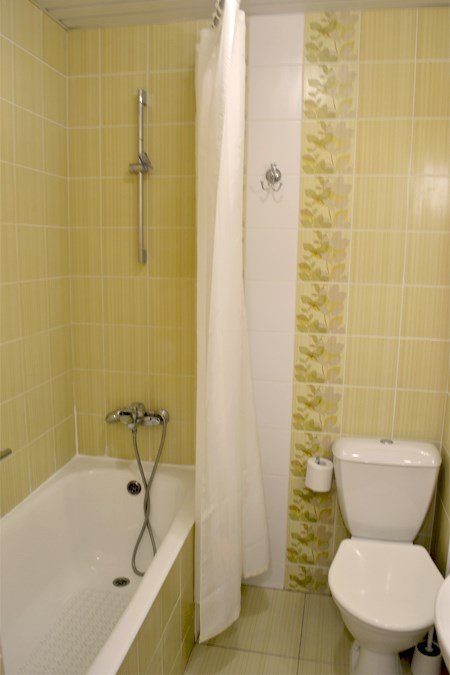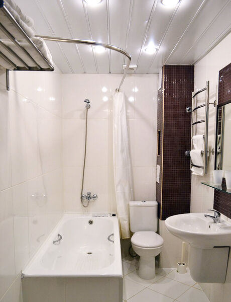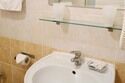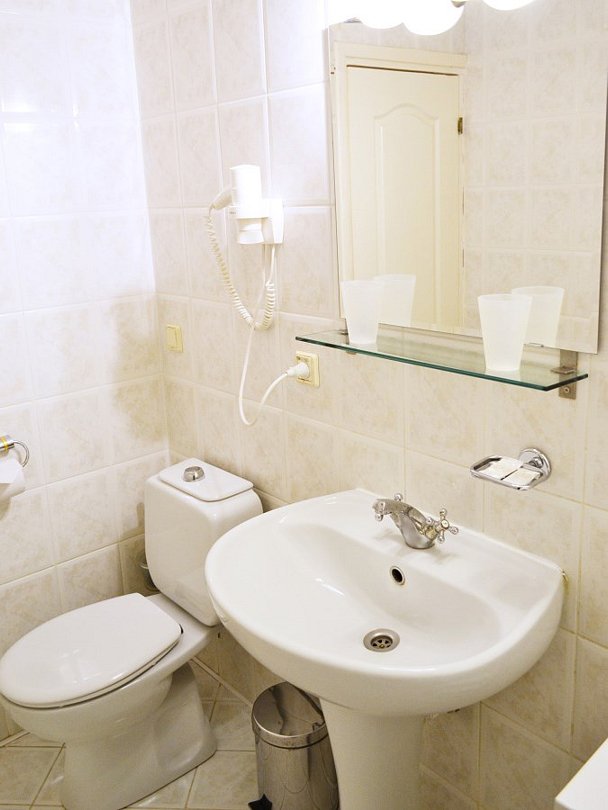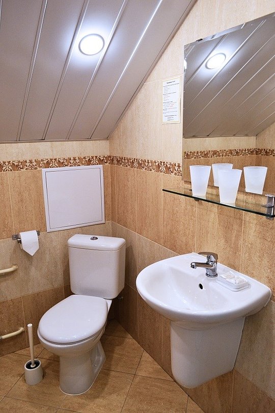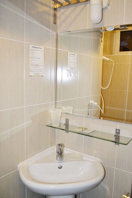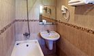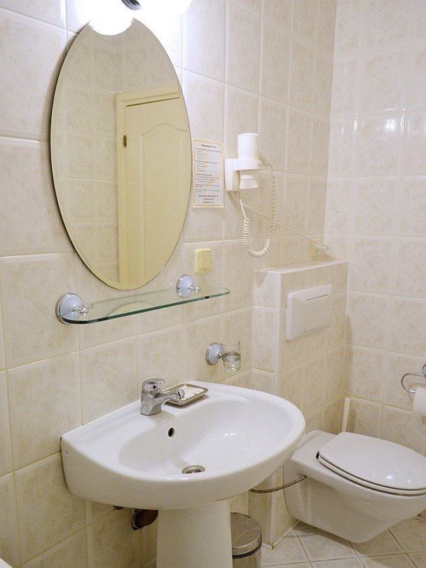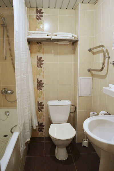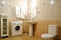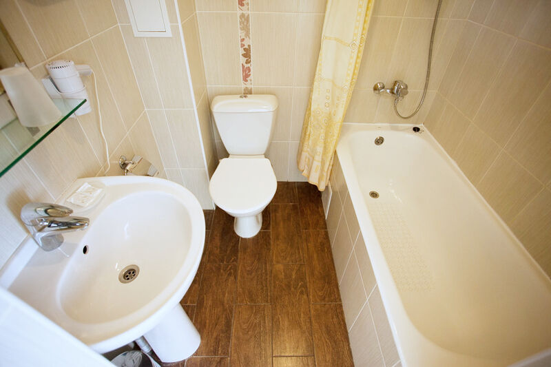 Ванная комната: ванна или душевая кабина, умывальник, туалет, фен, тапочки.