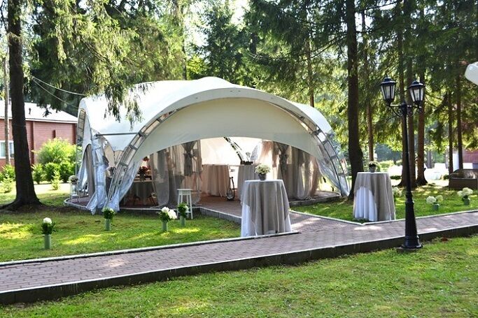 - снять шатер на свадьбу в Подмосковье или просторный, полный света, павильон — идеальный трендовый вариант для современной свадьбы в доме отдыха. При выборе площадки для проведения свадьбы будущие молодожены часто задают вопрос: «Какая свадьба лучше: в закрытом помещении или на природе, на открытой площадке?» Летом лучше выбрать открытый свадебный шатер или летний павильон. Свадебный шатер создает камерную, уютную обстановку и, в то же время, позволяет наслаждаться окружающей природой;