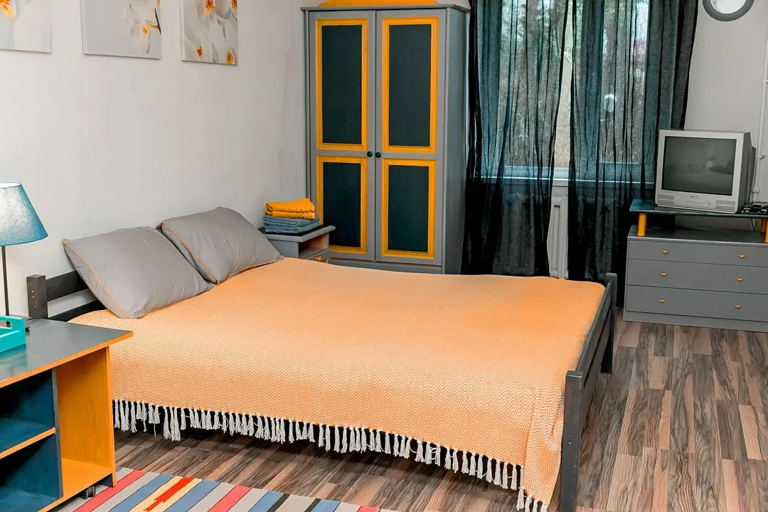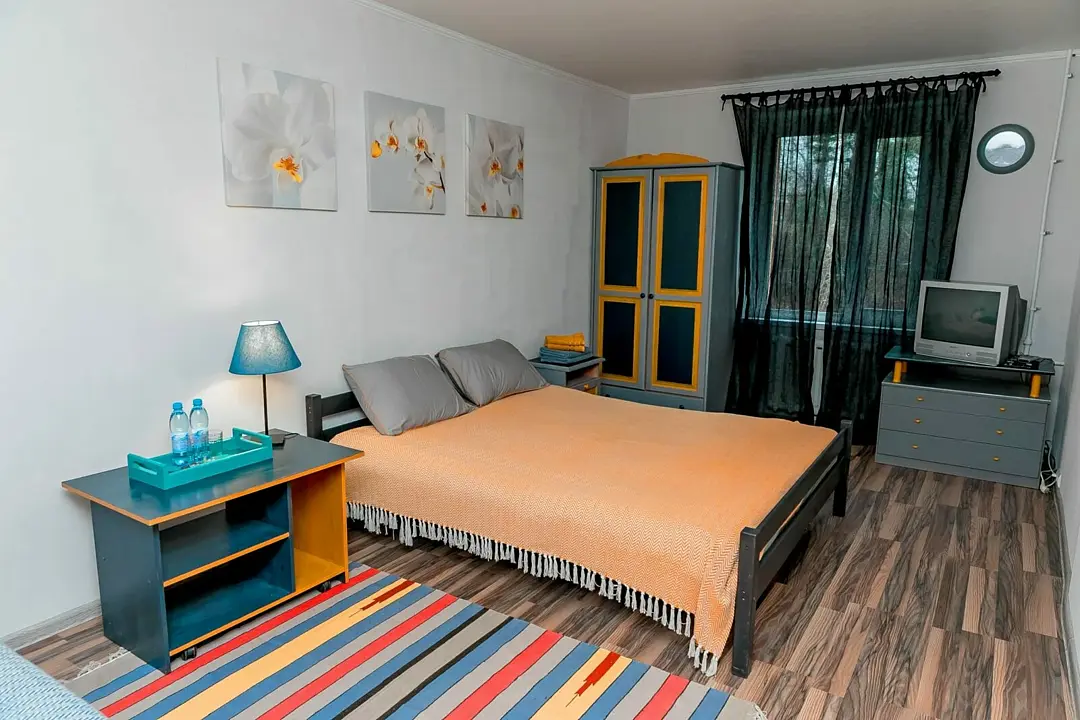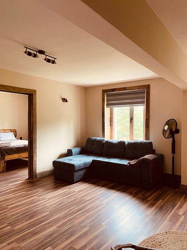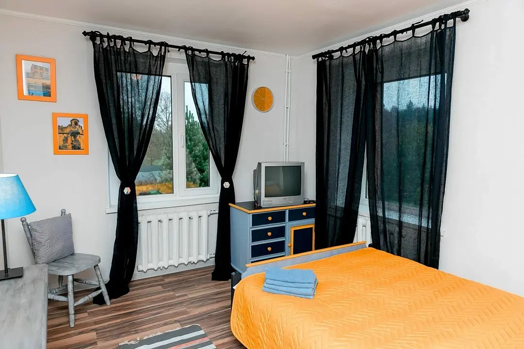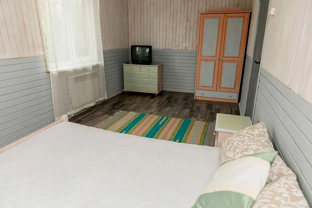 Большой и просторный апартамент площадью сорок квадратных метров находится на первом этаже отдельно стоящего коттеджа. Отдельная спальня оснащена двуспальной кроватью, шкафом и комодом, гостиная с раскладывающимся диваном и телевизором.