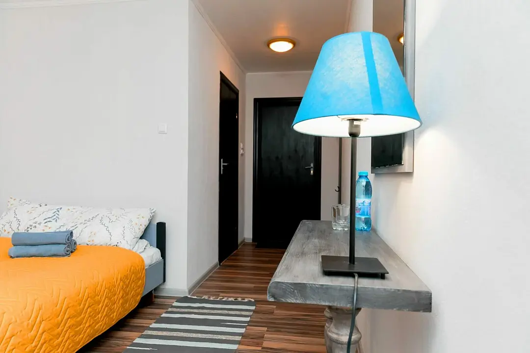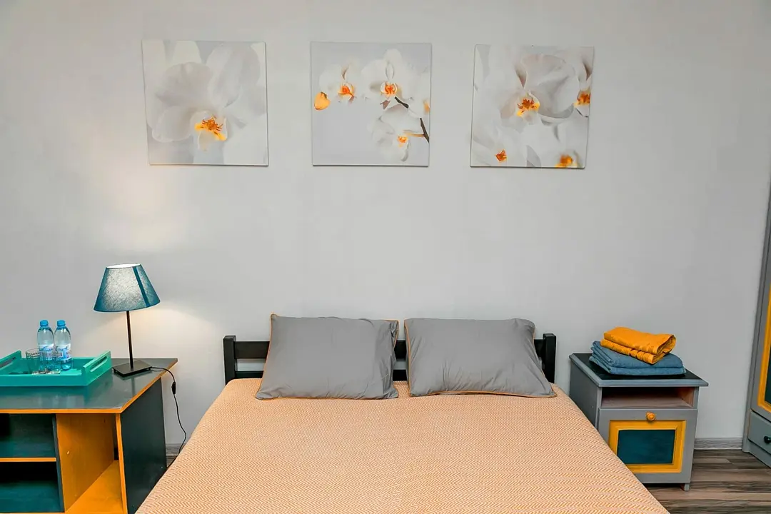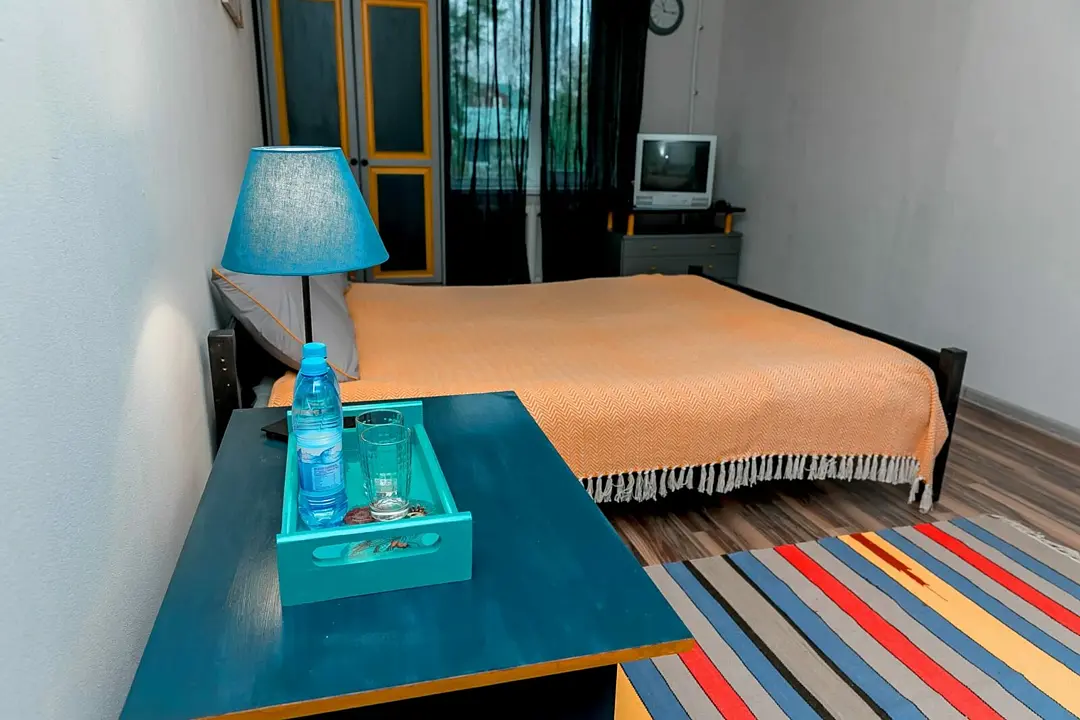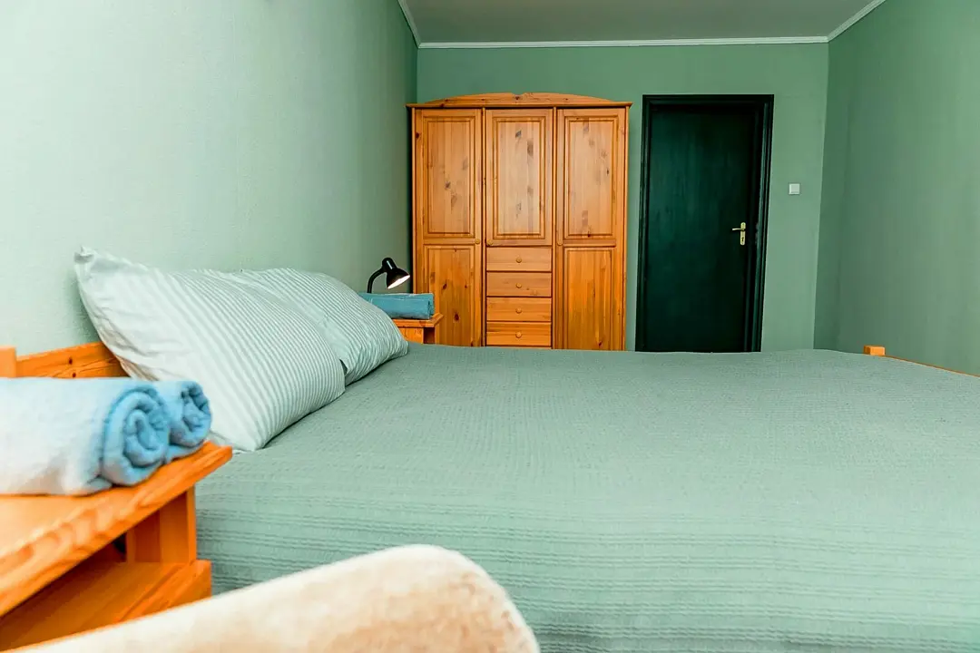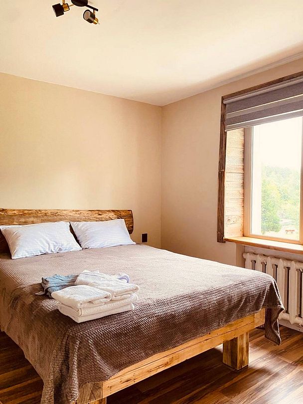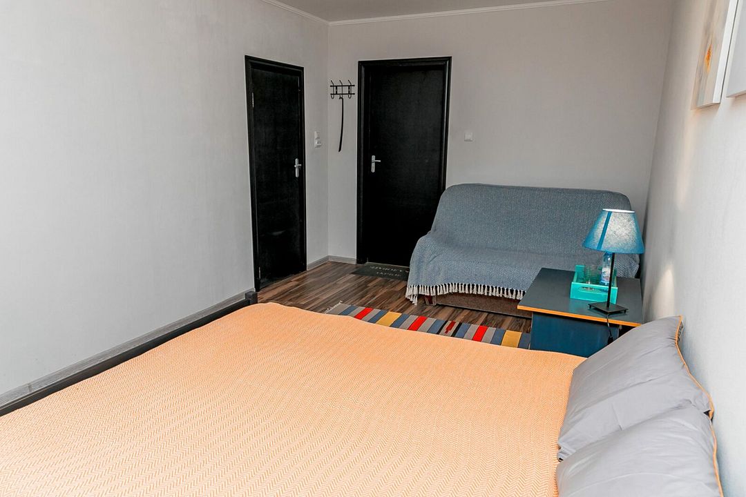 Большой и просторный апартамент площадью сорок квадратных метров находится на первом этаже отдельно стоящего коттеджа. Отдельная спальня оснащена двуспальной кроватью, шкафом и комодом, гостиная с раскладывающимся диваном и телевизором.