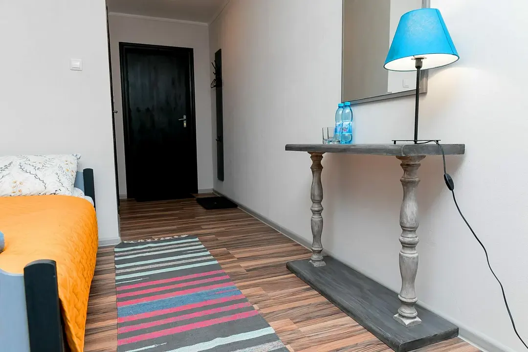 Стандартный однокомнатный номер площадью восемнадцать квадратных метров оснащен двуспальной кроватью, комодом, шкафом, столиком. Санузел совмещенный (душ и туалет).
