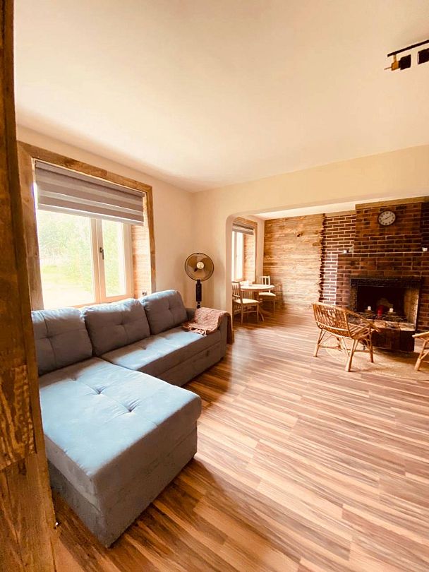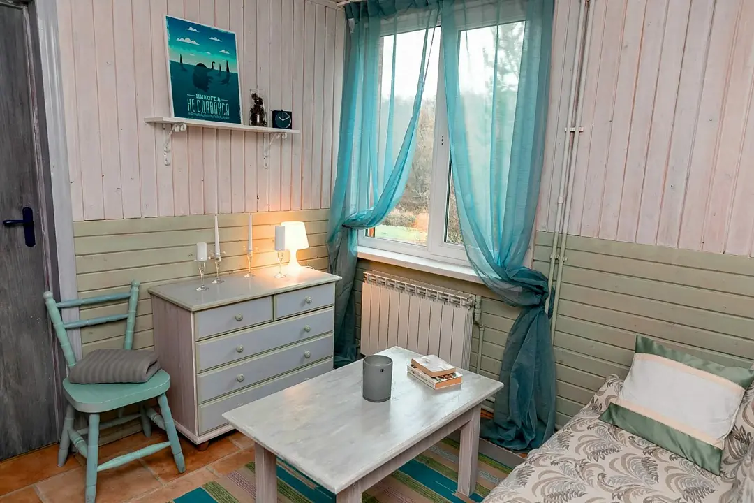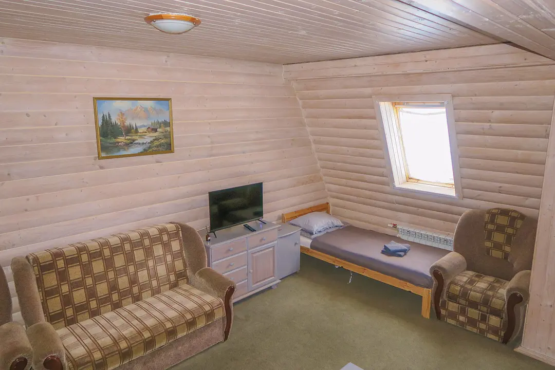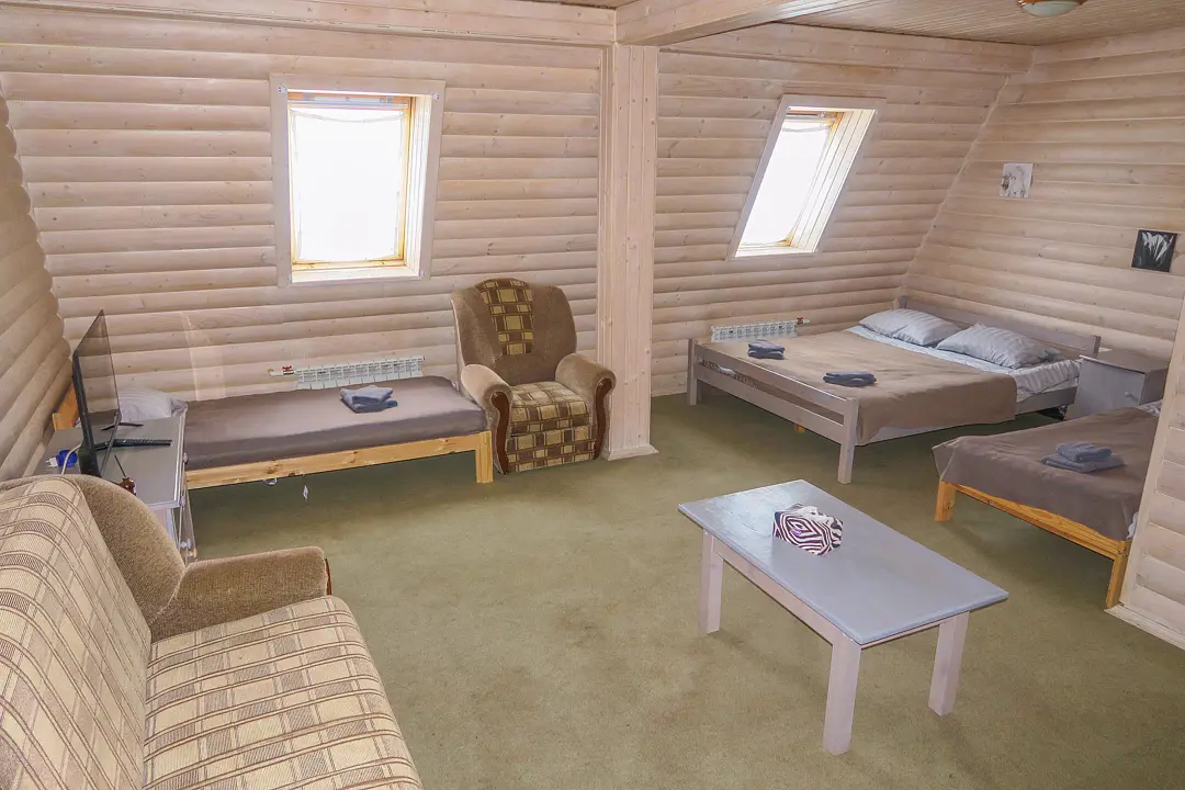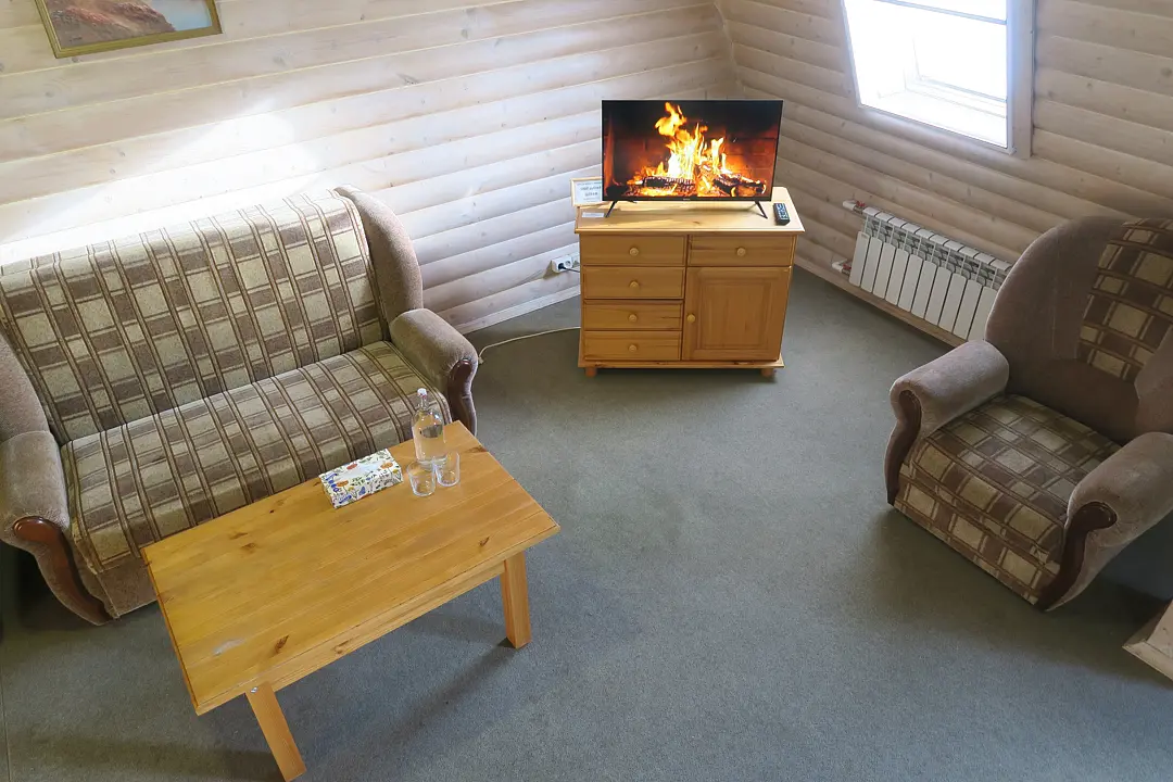 Общая гостиная, имеется раскладывающийся диван и телевизор. Кухня оборудована необходимой бытовой техникой. Санузел совмещенный (душ и туалет). Коттедж рассчитан на проживание от одного до восьми человек.