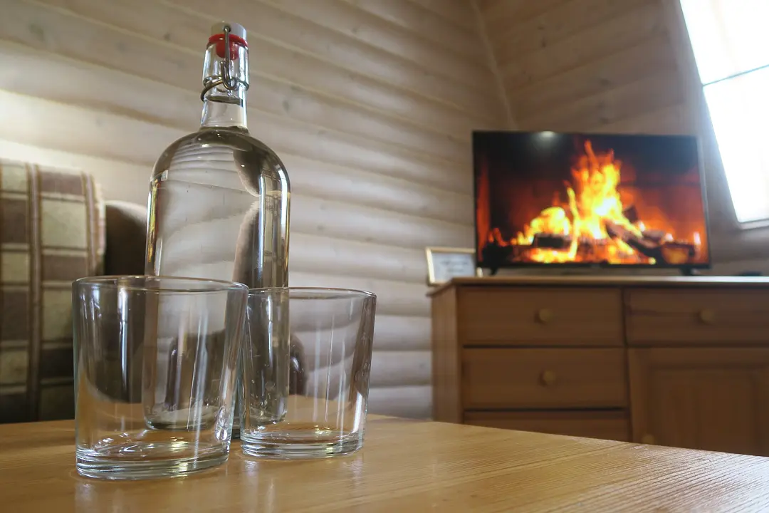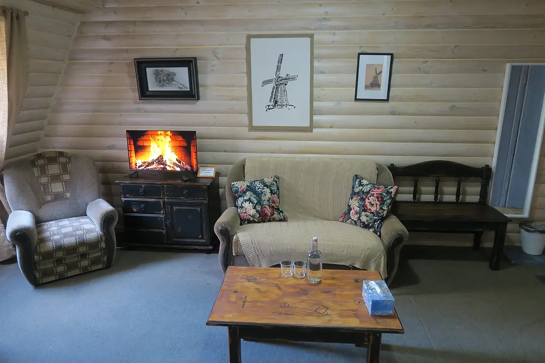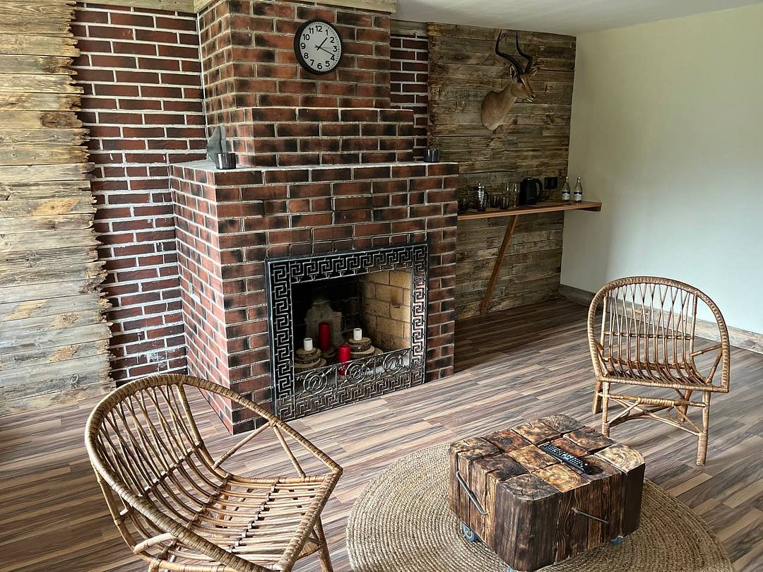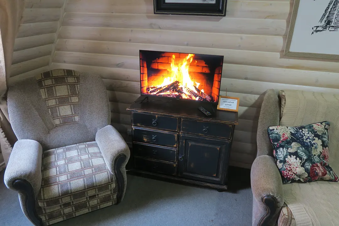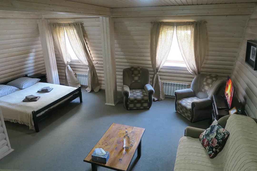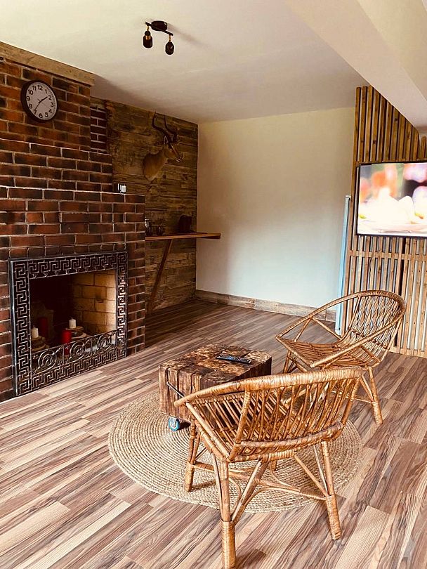 Двухкомнатный номер с камином площадью пятьдесят пять квадратных метров оснащен двуспальной кроватью, угловым диваном, двумя креслами, столом, комодом, шкафом, телевизором. Совмещенный санузел с душем.