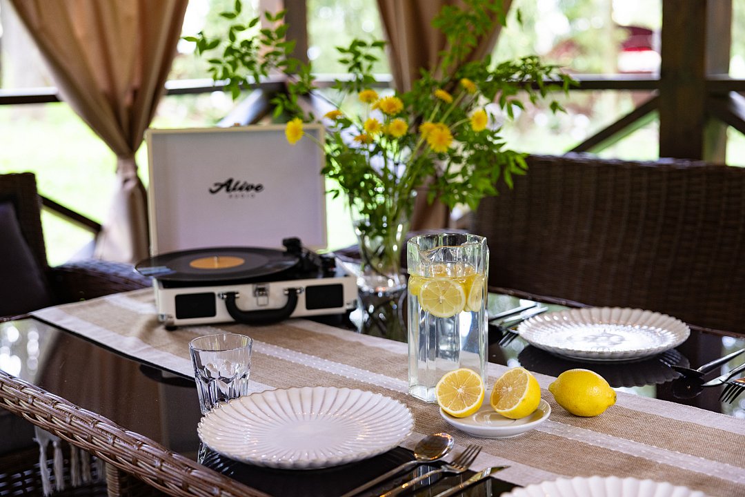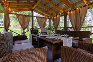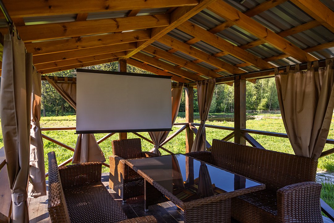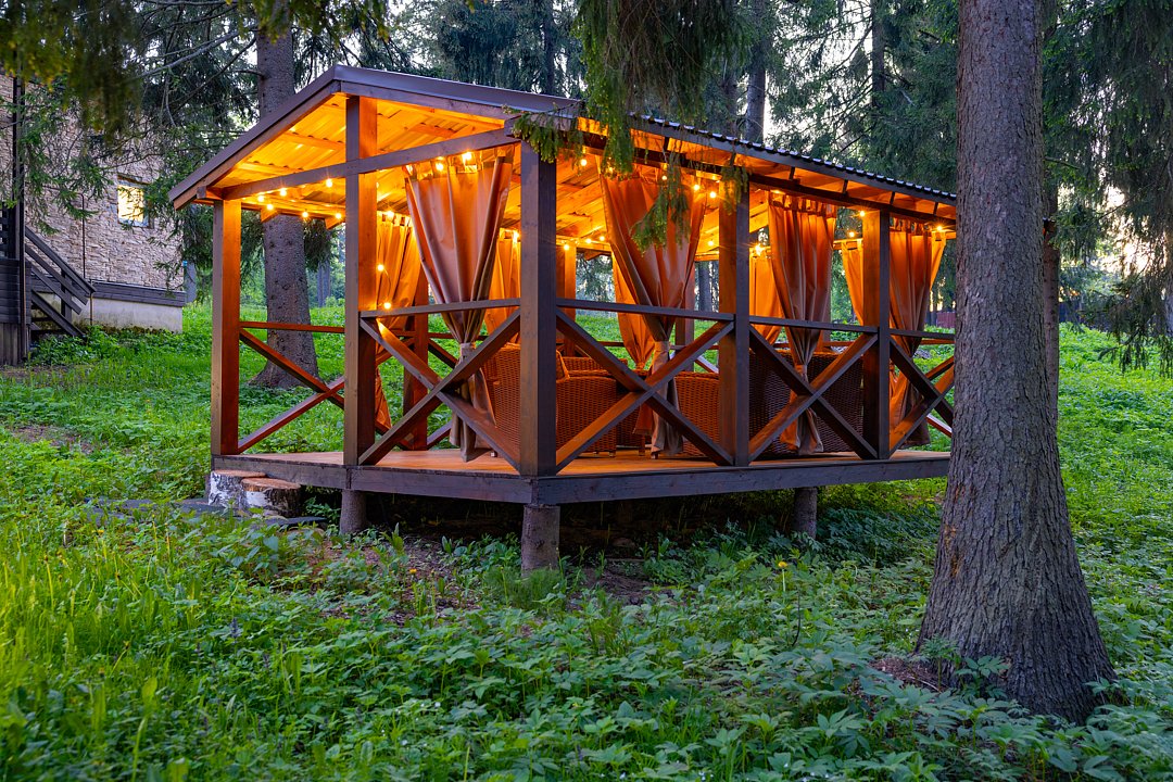 Уличные беседки с ротанговой мебелью, мягкими подушками и шторами, рассчитанные на восемь человек, станут отличным местом для отдыха на свежем воздухе. Для гостей предусмотрены пледы, вечерняя уборка, а также мангальная зона с шампурами и решетками для барбекю.