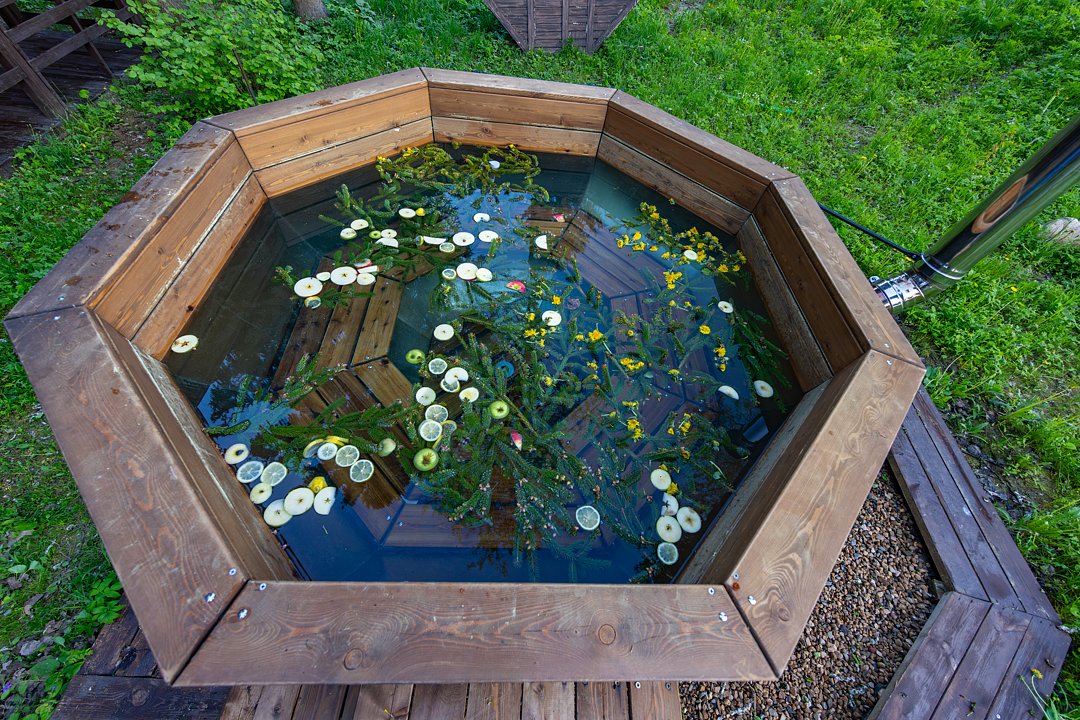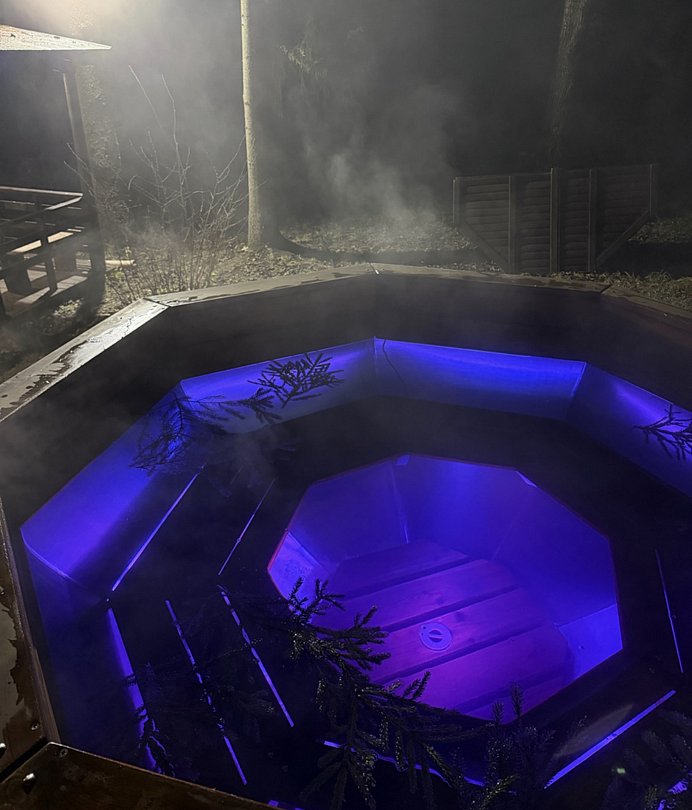 Банный чан на открытом воздухе находится в окружении густого елового леса, что создает неповторимую атмосферу уюта и умиротворения. Вмещает до шести человек, поэтому подходит как для романтического вечера вдвоем, так и для встреч с друзьями или семьей. Теплая вода, аромат свежей древесины и естественная тишина обеспечивают идеальные условия для отдыха в любое время года.