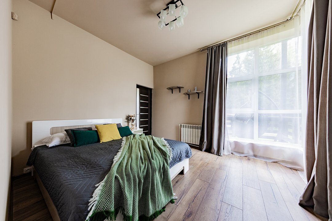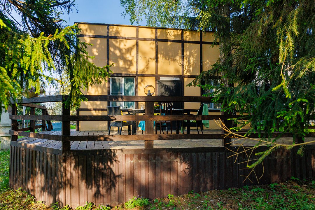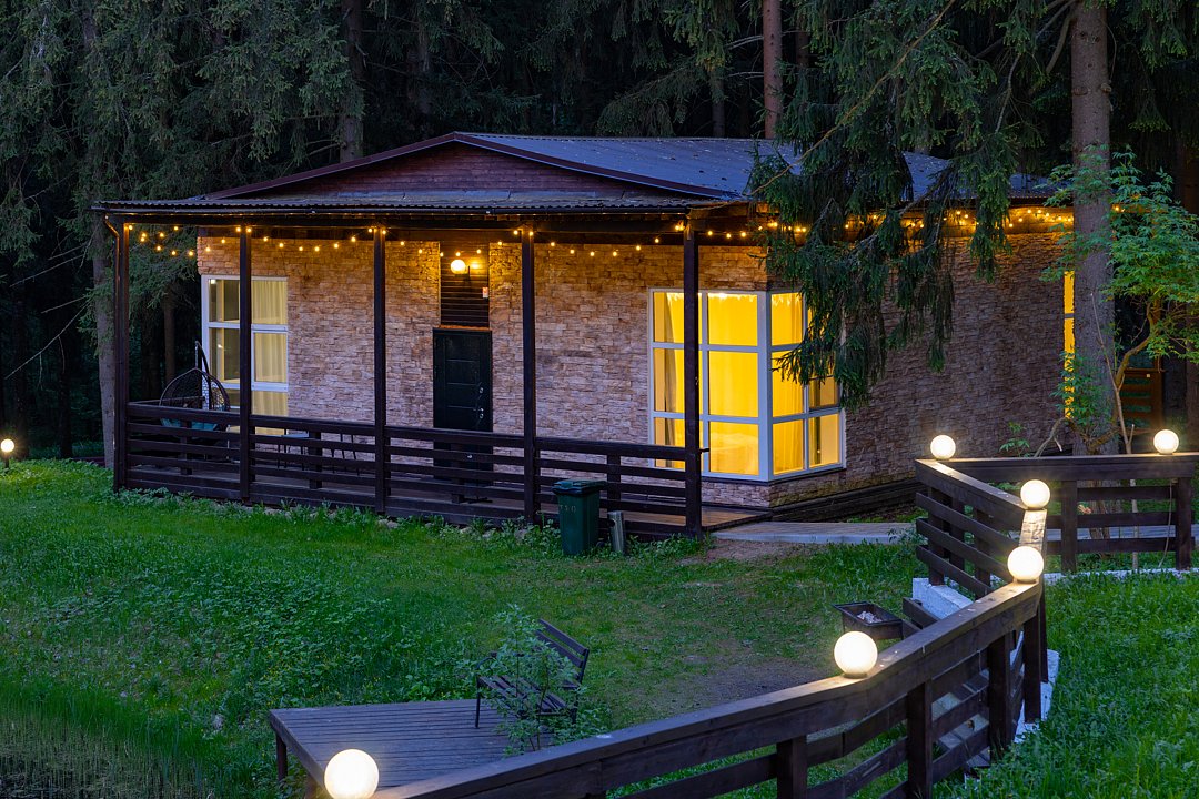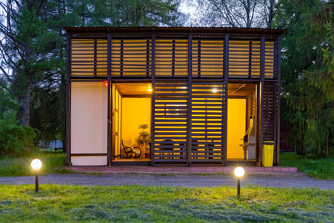 Дом «Семейный №1» — уютный домик с панорамными окнами и верандой. Три комнаты, восемь спальных мест. Удобства: Wi-Fi, микроволновая печь, плита, чайник, холодильник, телевизор, фен, посуда, полотенца, тапочки.