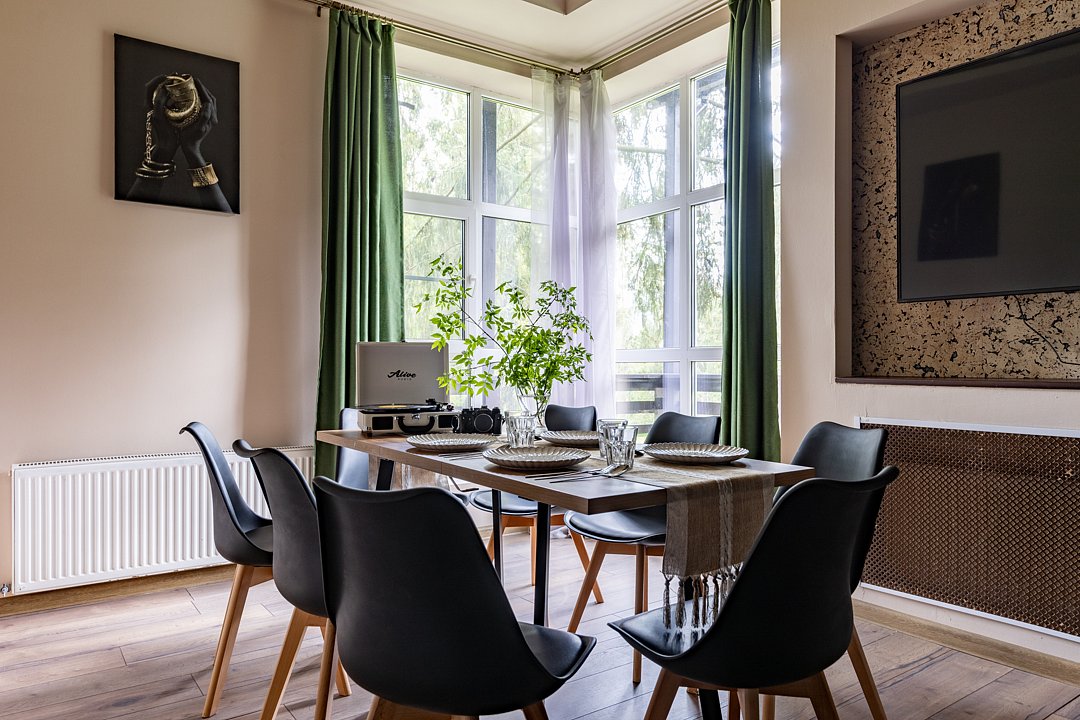 Загородный дом находится в живописном уголке природы, окруженный густым зеленым лесом. Дом выполнен в современном стиле, с очень уютной и спокойной атмосферой.