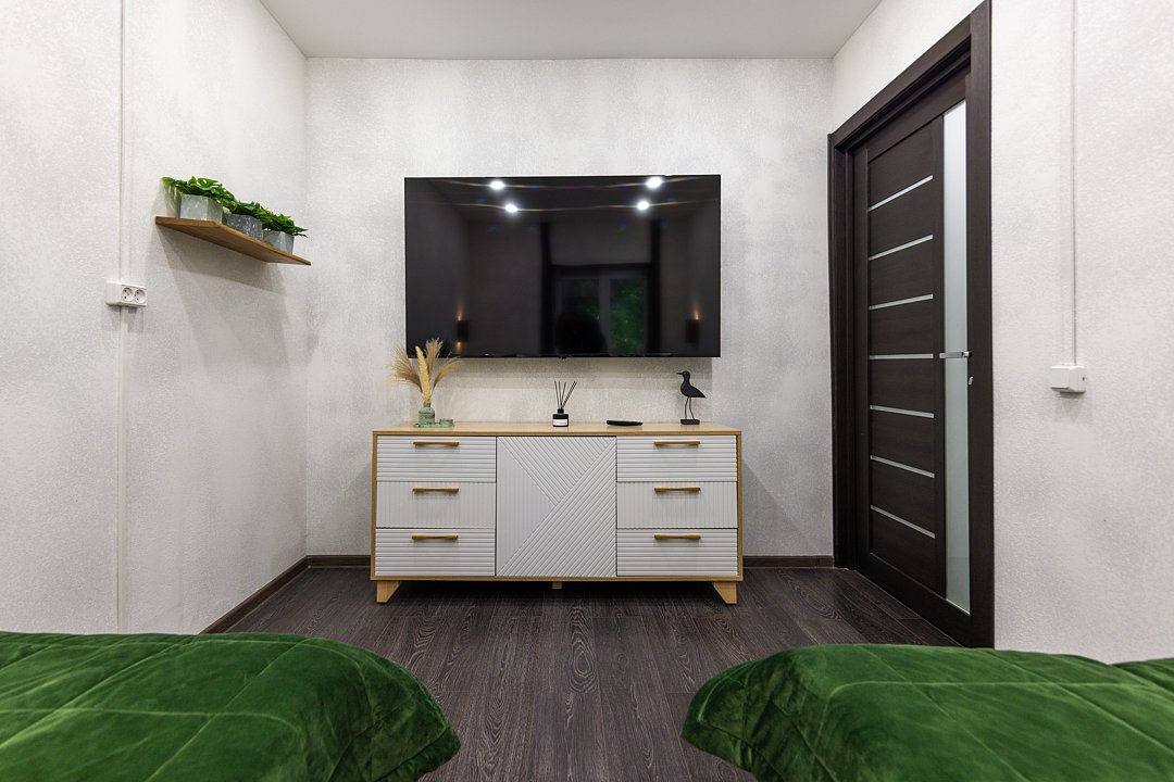 Дом «Солнечный №2». Четыре спальных места, две комнаты. Все удобства для проживания: Wi-Fi, микроволновая печь, электроплита, чайник, холодильник, телевизор, фен, столовые приборы, посуда, полотенца, одноразовые тапочки, туалет, душ.