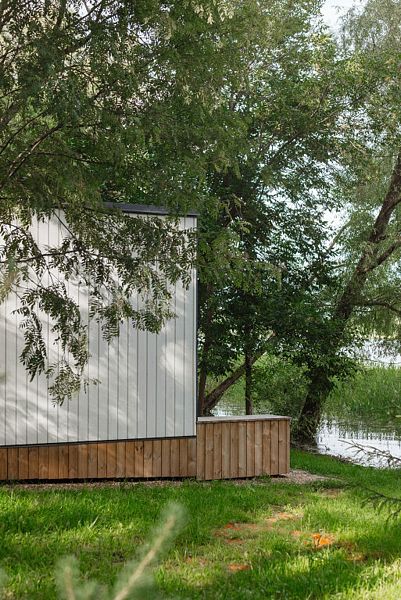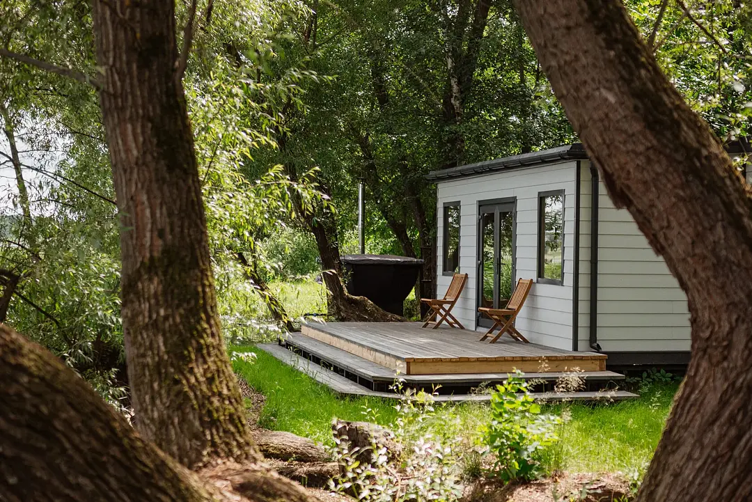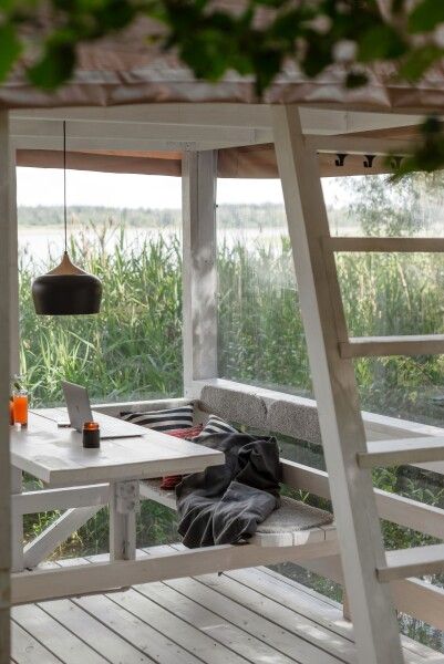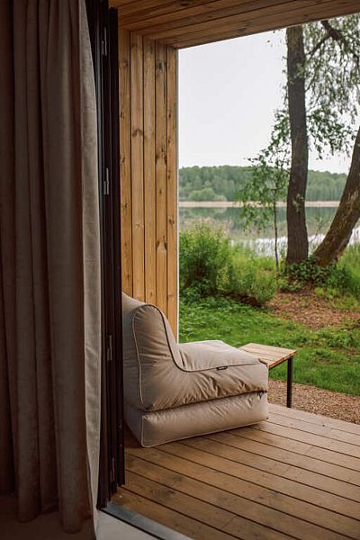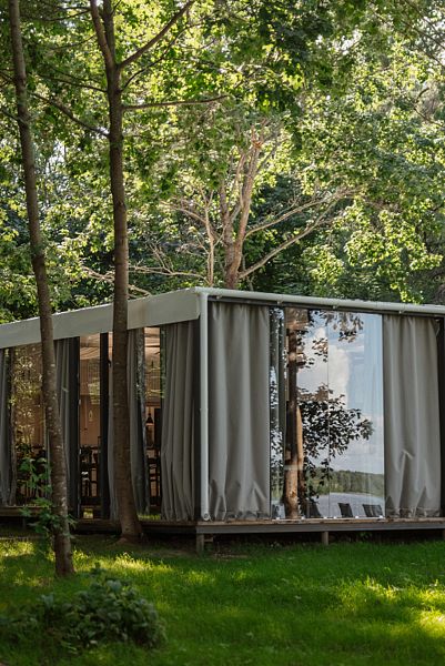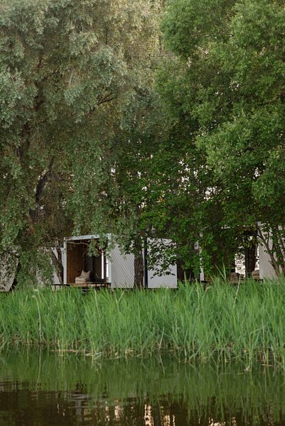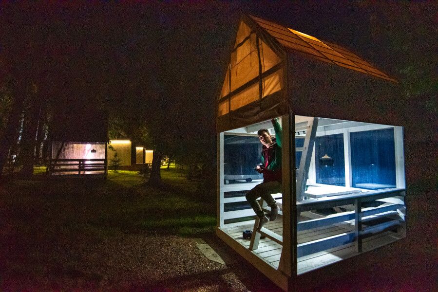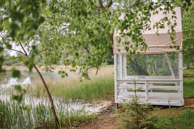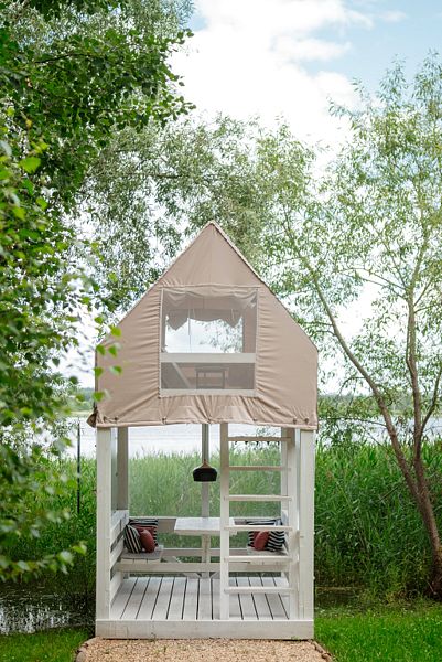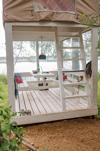 На первом этаже расположена гостиная-беседка с видом на лес или реку, а на втором этаже — уютные спальные места под крышей.