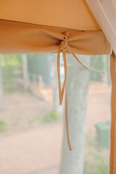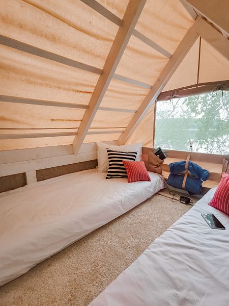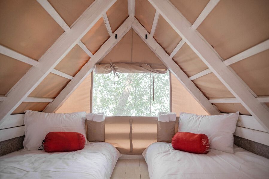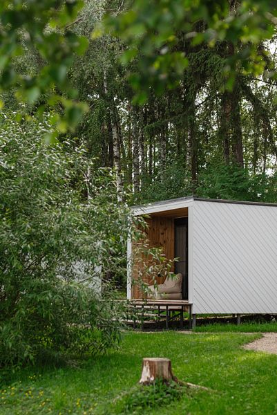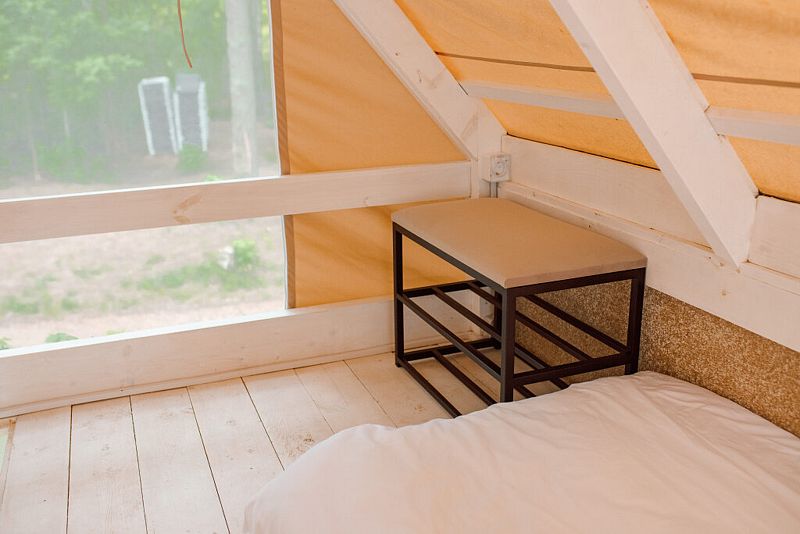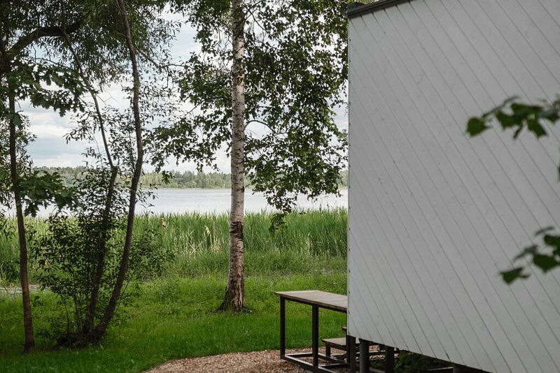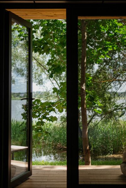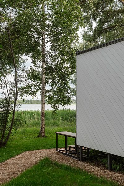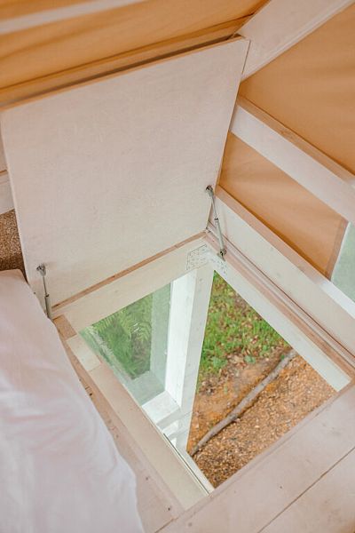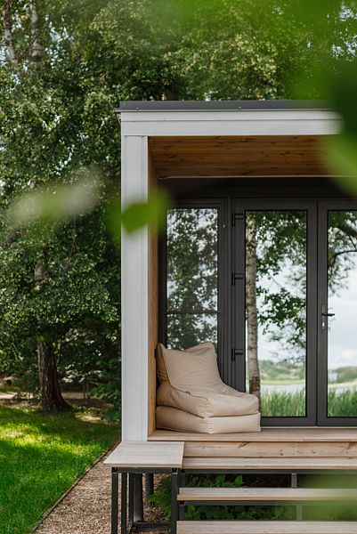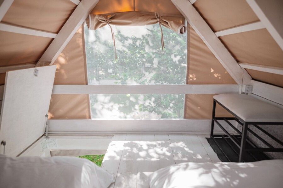 На первом этаже расположена гостиная-беседка с видом на лес или реку, а на втором этаже — уютные спальные места под крышей.