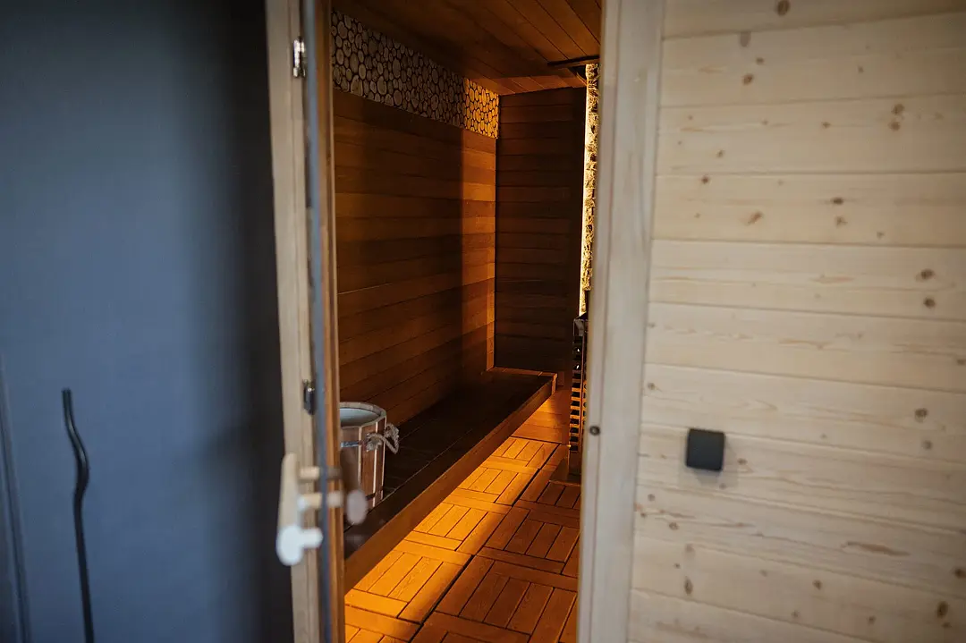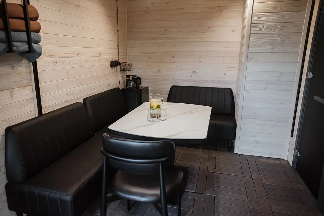 Вторая баня в комплексе, рядом с которой расположен малый чан на 4–6 человек. Внутри бани комната отдыха, стол для компании гостей, парилка и санузел. Есть полотенца, в душе есть косметические принадлежности и фен и банные аксессуары.