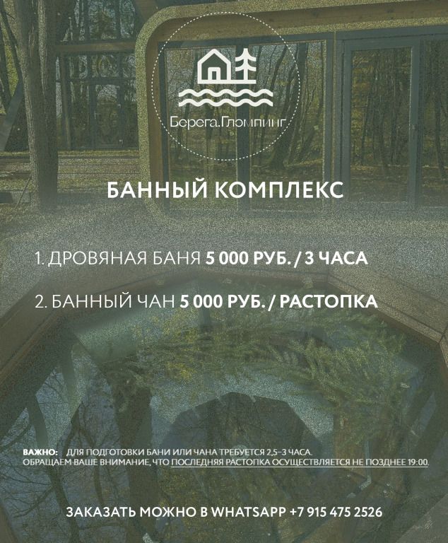 *Банный комплекс оплачивается отдельно и включает в себя: •Банный чан на дровах – 5 000 рублей/растопка •Баня на дровах – 5 000 рублей/растопка.