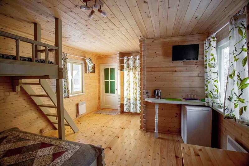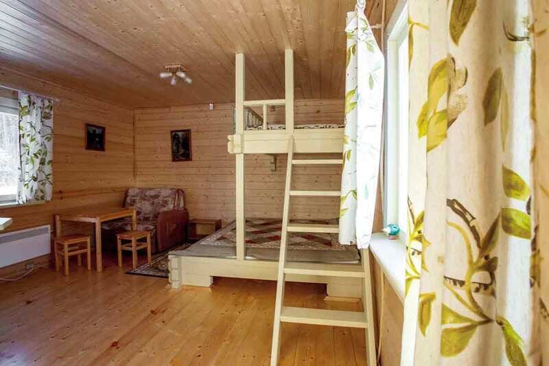 Предоставляется до 5 спальных мест в комфортабельных коттеджах: 2 спальная кровать, мини-диван и 1 место мансардного типа. Домики расчитаны на проживание 3 взрослых и 2 ребёнка до 14 лет.