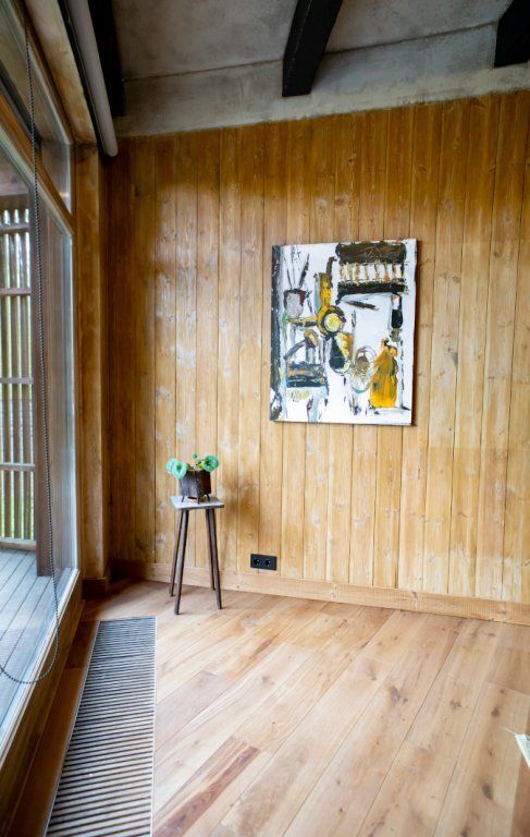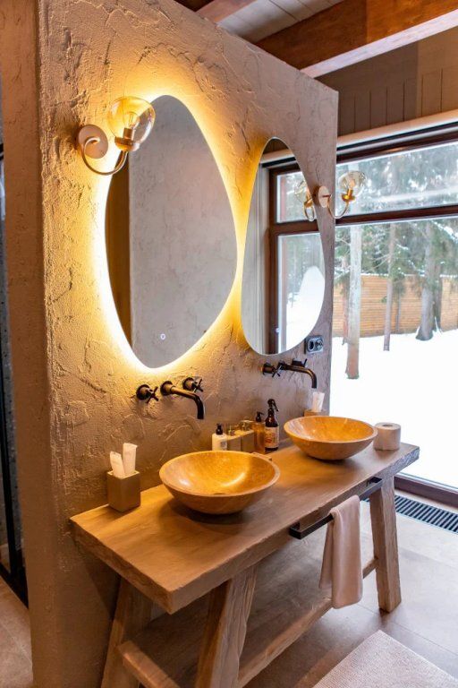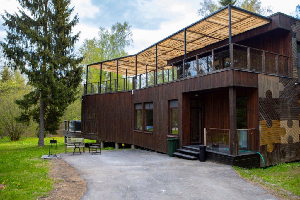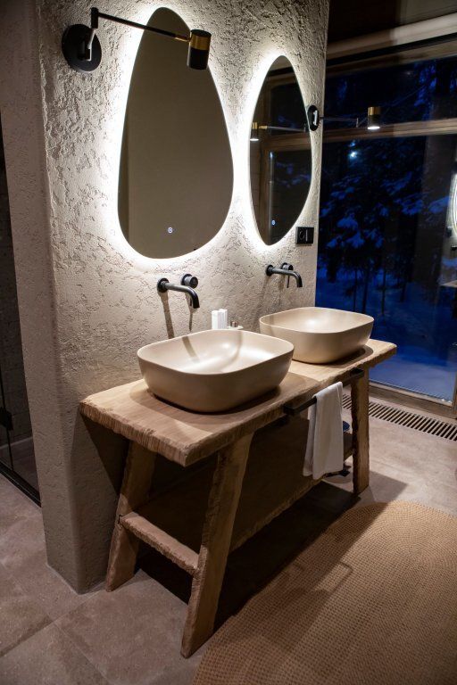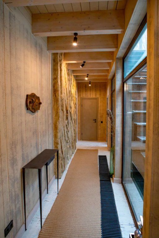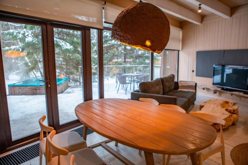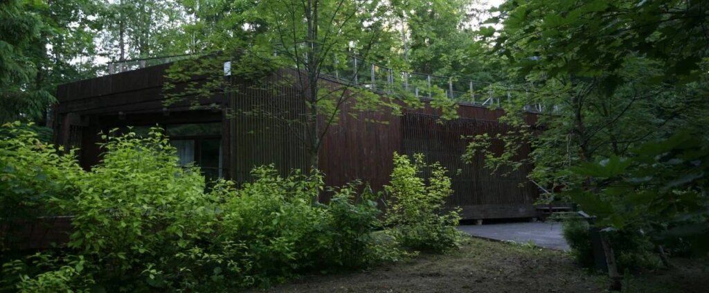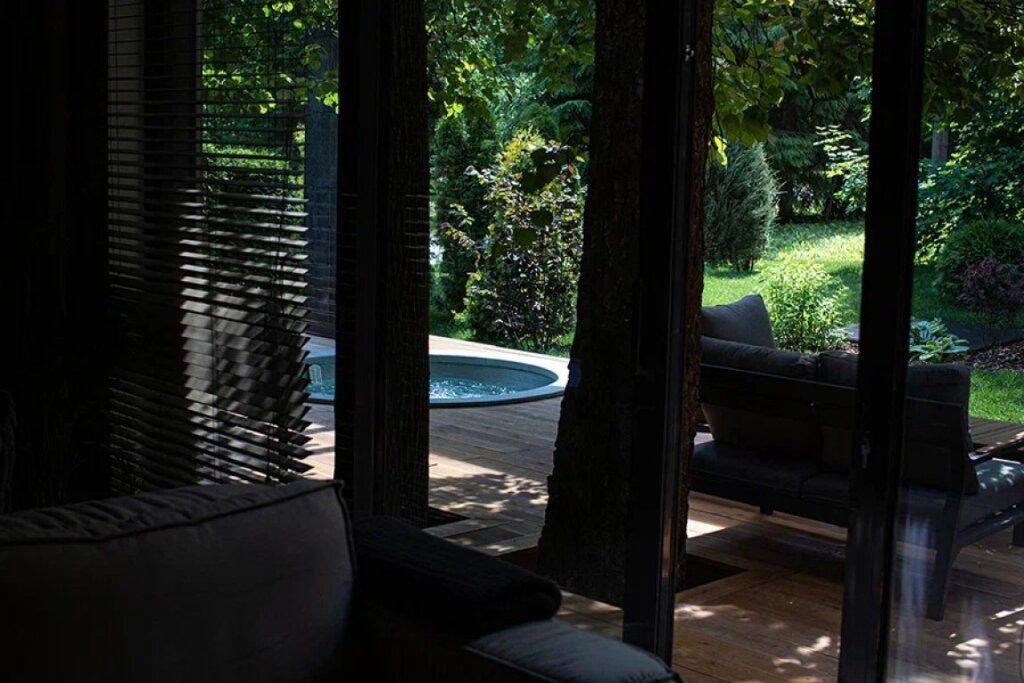 Банный комплекс находится в отдельно стоящем здании в лесу площадью 350 кв. м. Через панорамные окна открывается умиротворяющий вид, а зимой с террасы можно выйти прямо на снег.
