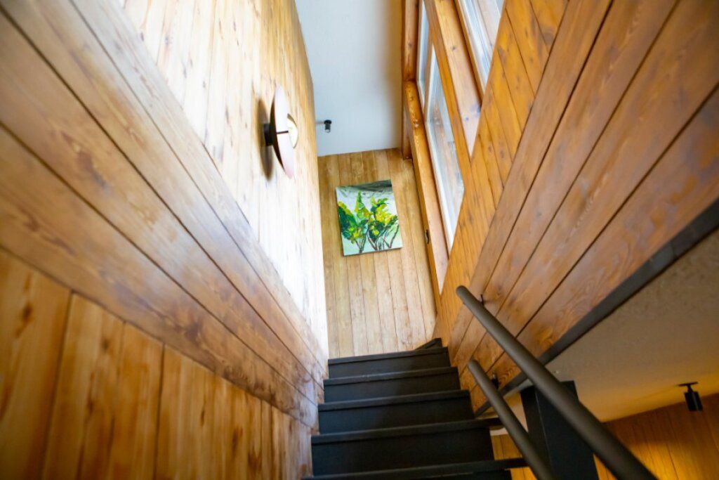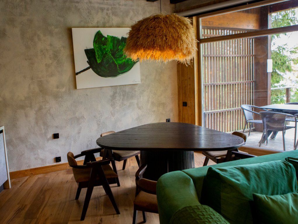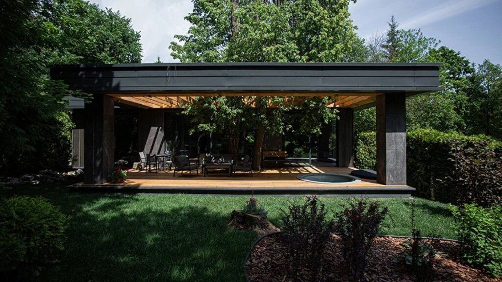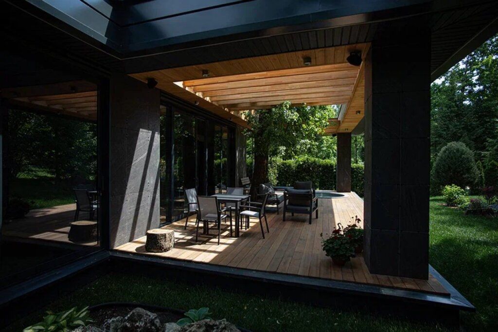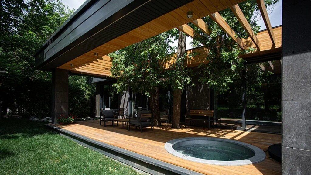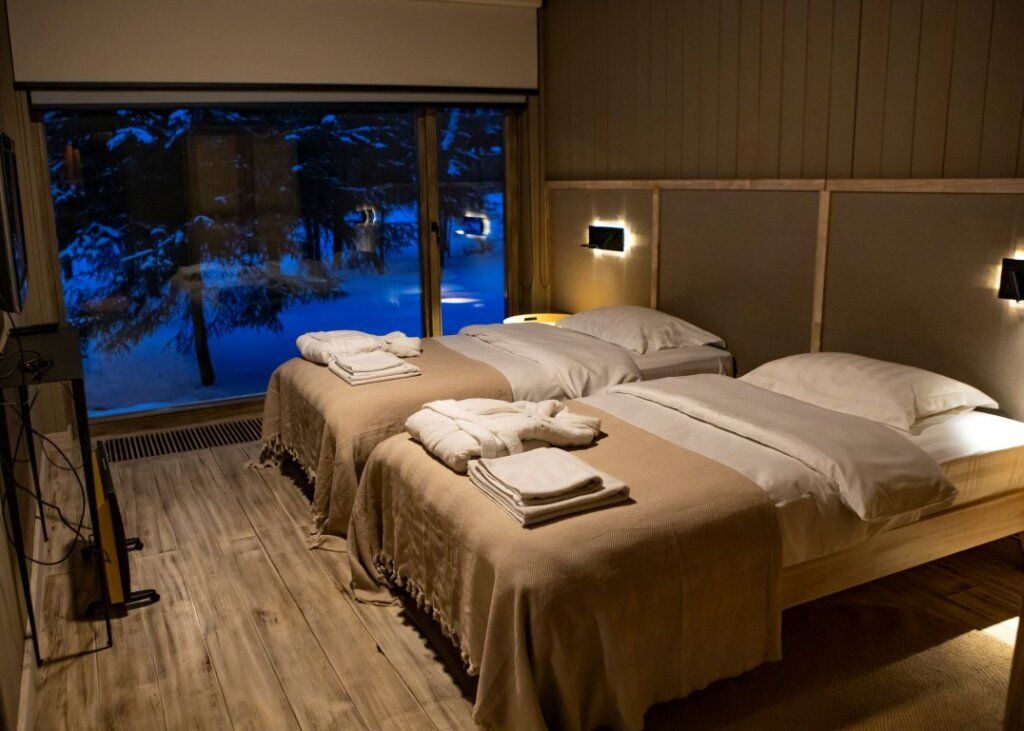 Банный комплекс находится в отдельно стоящем здании в лесу площадью 350 кв. м. Через панорамные окна открывается умиротворяющий вид, а зимой с террасы можно выйти прямо на снег.