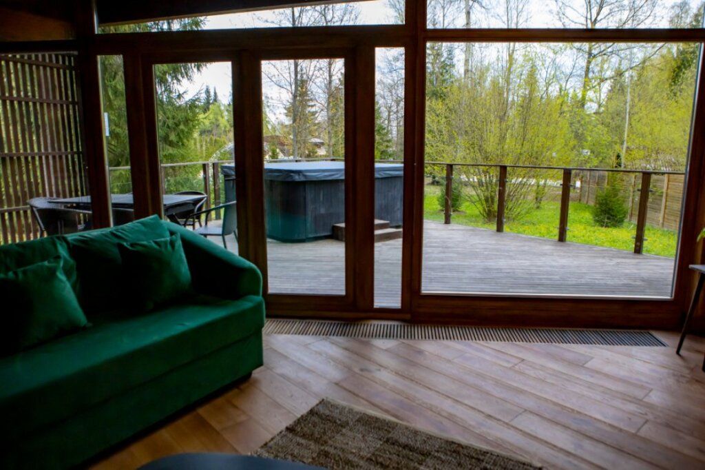 В доме 2 спальни со своими санузлами и ванными комнатами, обеденная зона с диваном и столом, кухня. Большая, комфортабельная терраса с диванами и джакузи. Зона с мангалами. Домик закрыт зеленой живой изгородью. Можно подъехать к двери домика на авто, разгрузить вещи