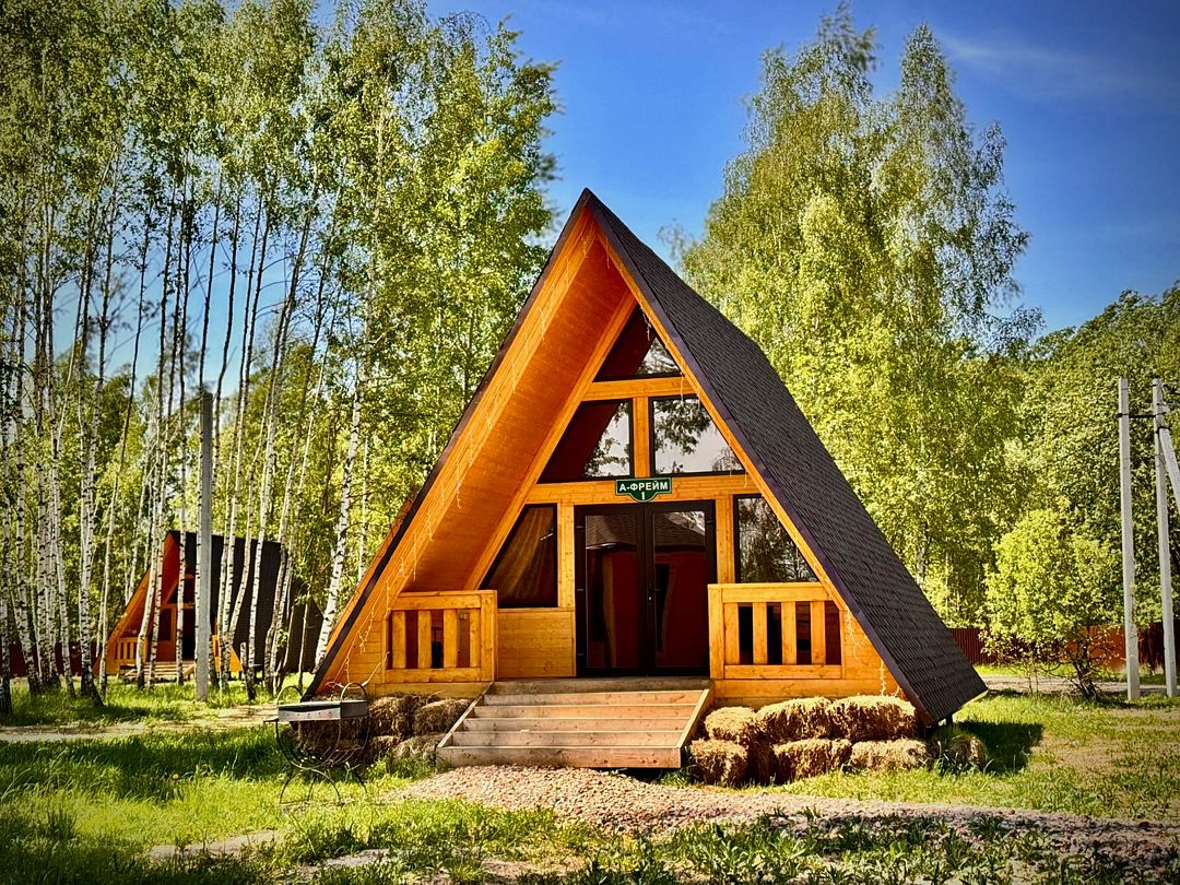 А-фрейм дом с мансардой, санузлом и террасой.