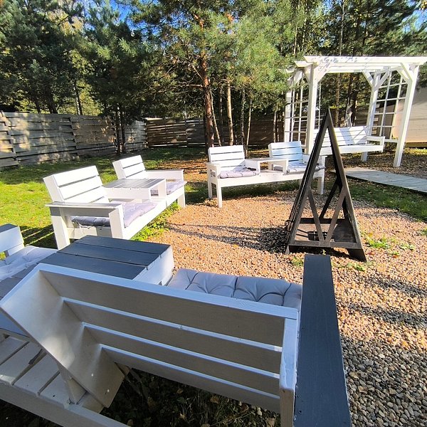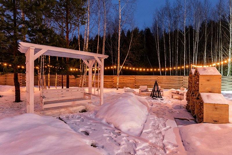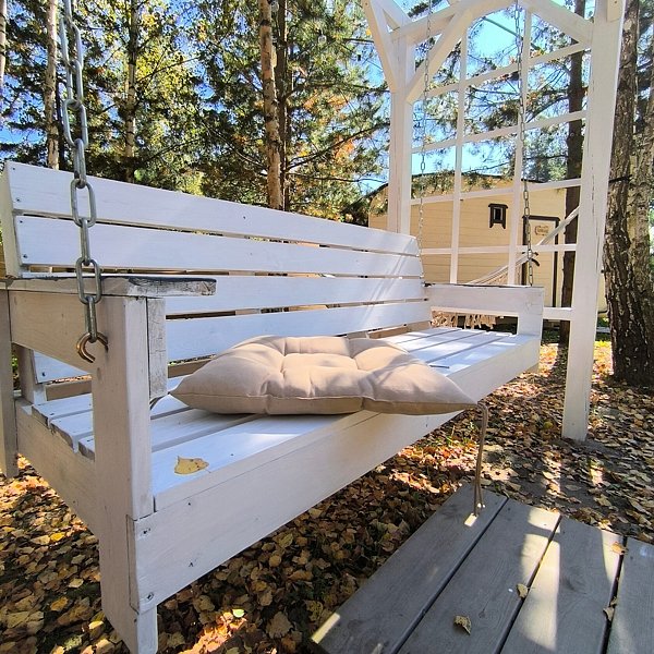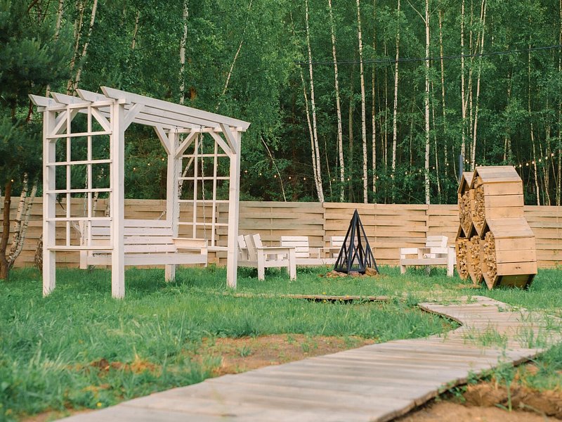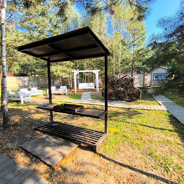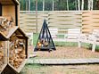 На каждом участке есть качели, крытый мангал и зона отдыха с кострищем.