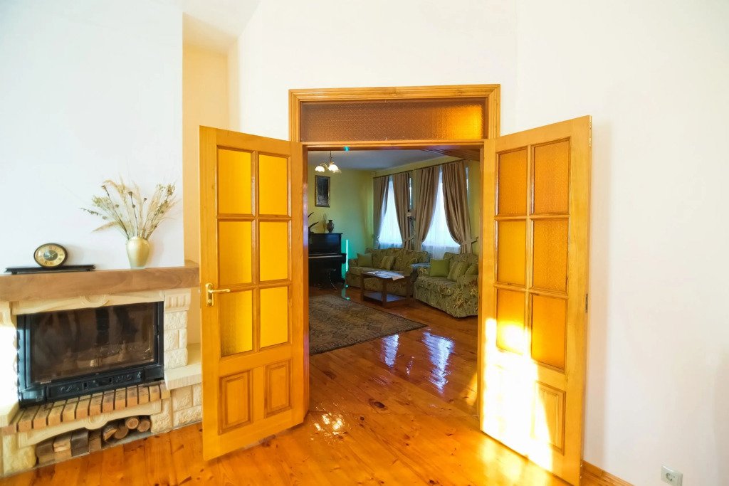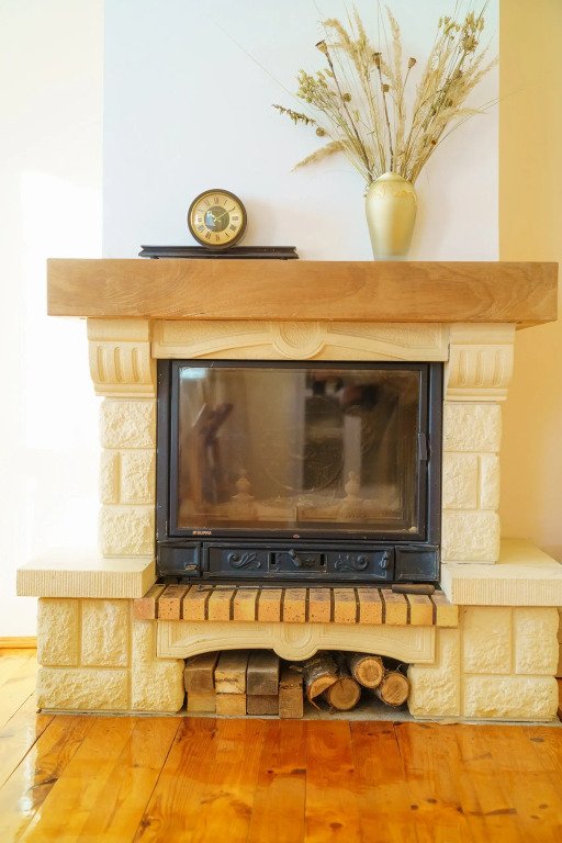 1 этаж: каминная со столом, гдe могут разместиться дo 10 гocтей, можно добавить стол и стулья по предварительному запросу; доступны праздничные фужеры, скатерть, телевизор, камин на дровах.