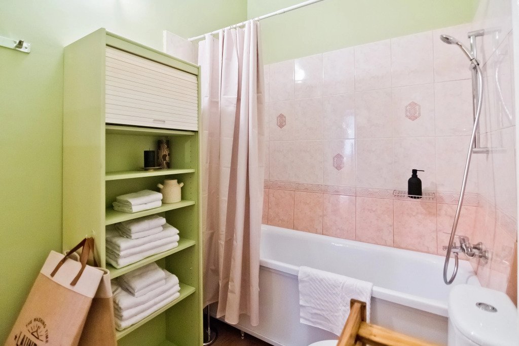 На двух этажах по 1 санузлу с гигиеническими принадлежностями: полотенца для лица, тела и ног, мыло, гели, шампуни, фен; утюг и гладильная доска по запросу.