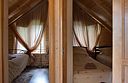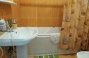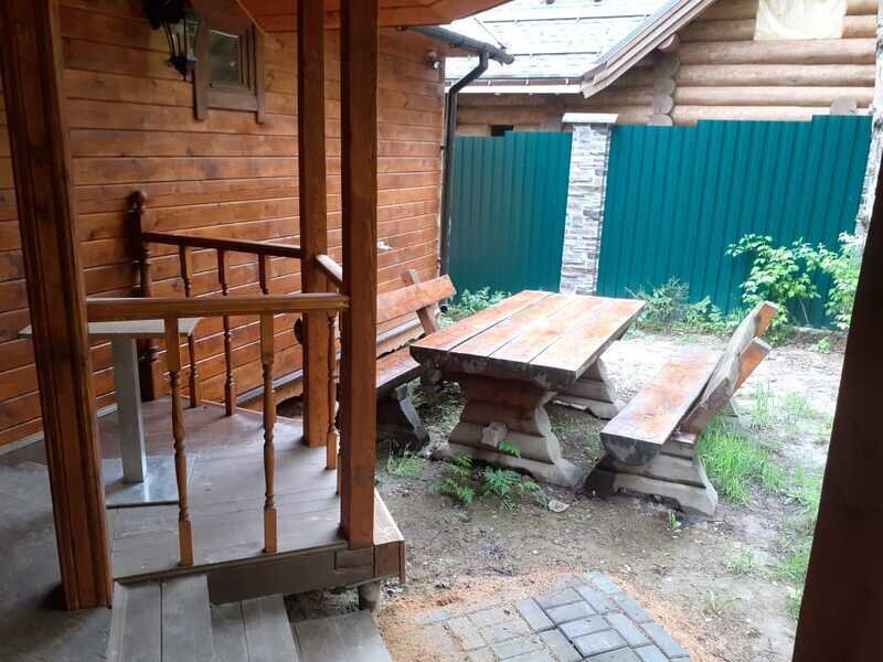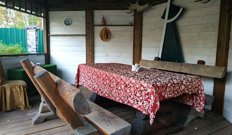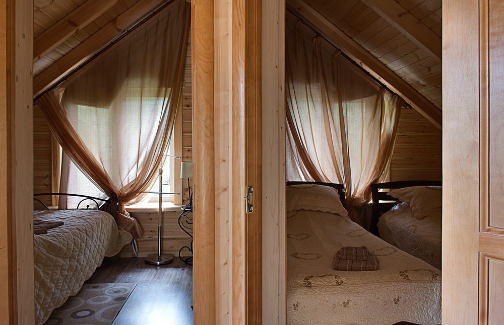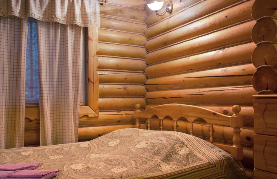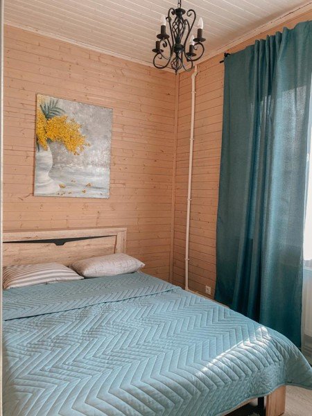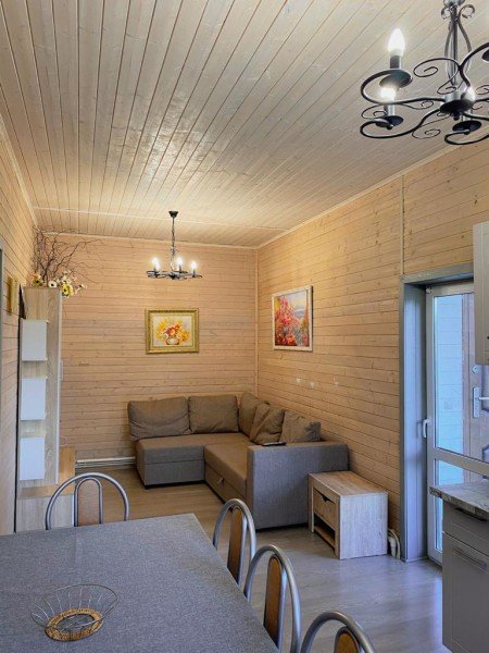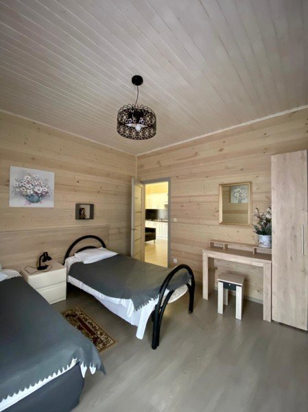 Уютная изба из деревянного сруба. Кухня-гостиная и три спальни, душевая комната. Две двуспальные кровати размера king-size и двухуровневая кровать размера king-size.