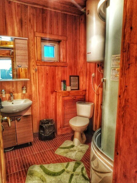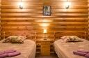 Уютная изба из деревянного сруба. Кухня-гостиная и спальня, душевая комната. Две двуспальные кровати в спальне.