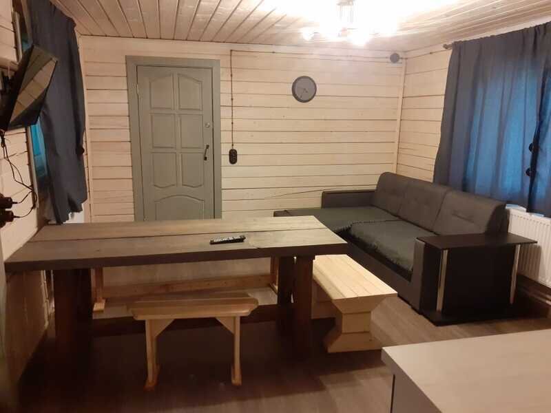 Уютная изба из деревянного сруба. Кухня-гостиная и спальня, душевая комната. Две кровати размера king-size и дополнительные спальные места на диване.