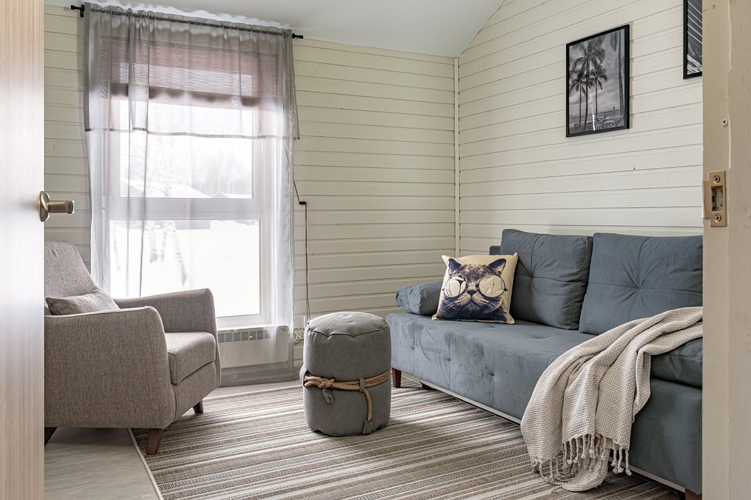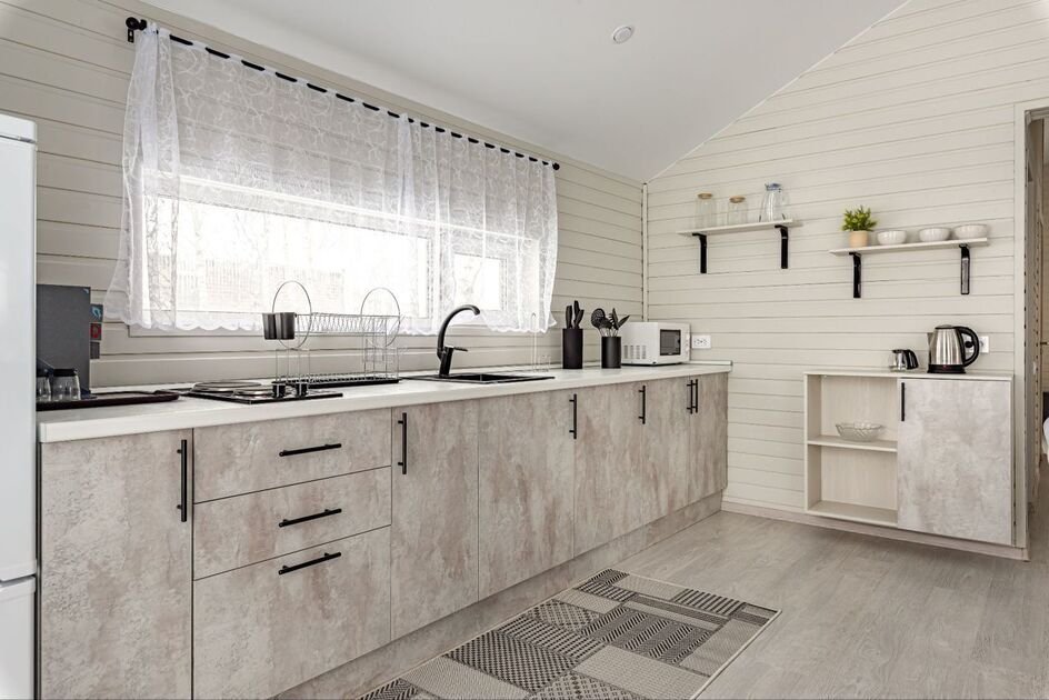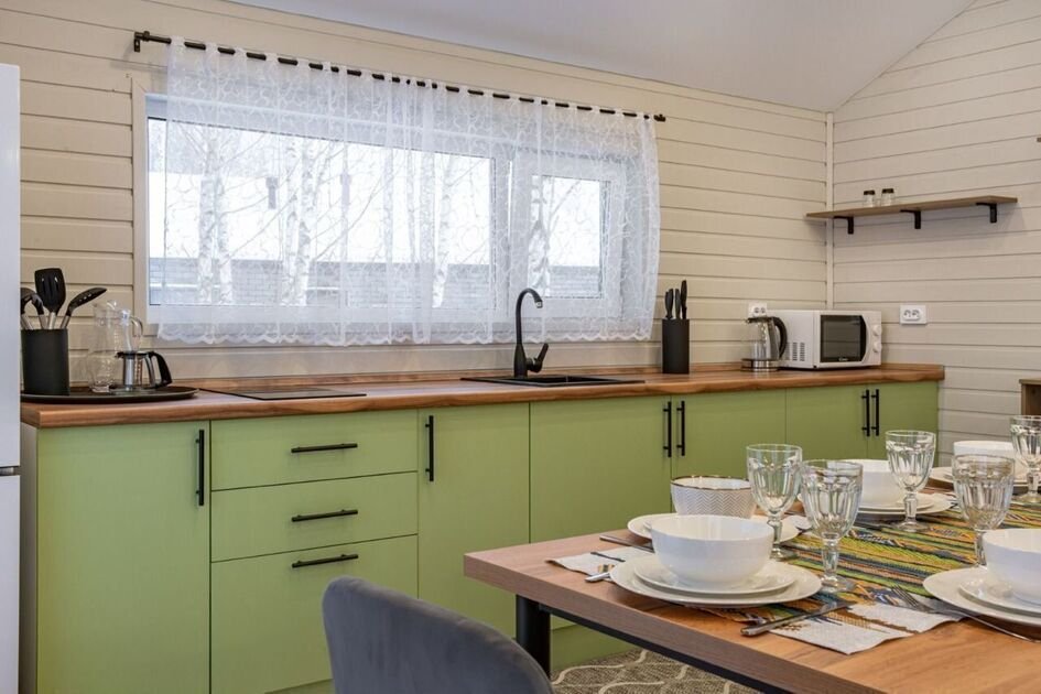 Гостиная: просторный раскладывающийся диван; телевизор; удобное кресло; выход на террасу; умная колонка «Алиса» — для музыкального сопровождения, новостей или беседы. Кухня: большой обеденный стол; вся необходимая посуда; микроволновая печь; варочная панель; чайник; кофеварка; базовый набор продуктов: чай, кофе, специи, соль, сахар, растительное масло.