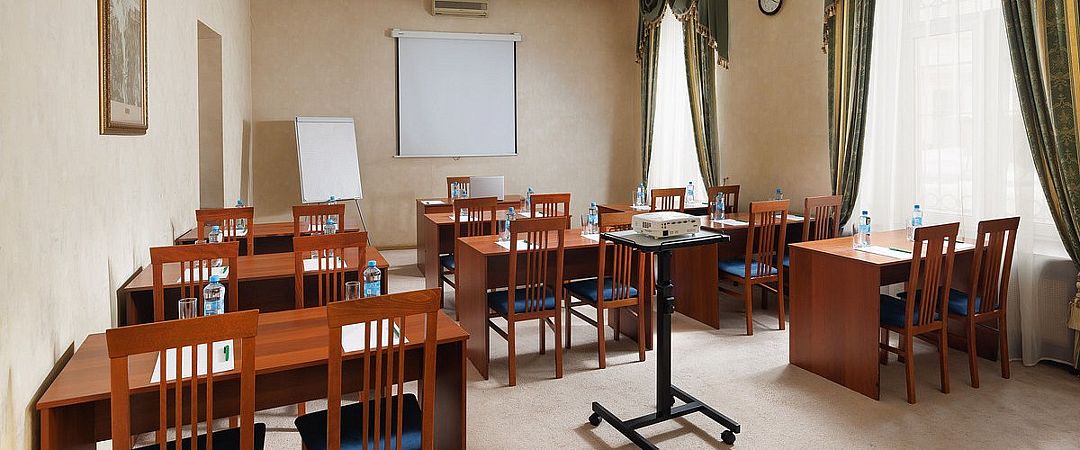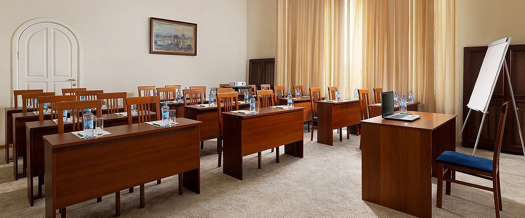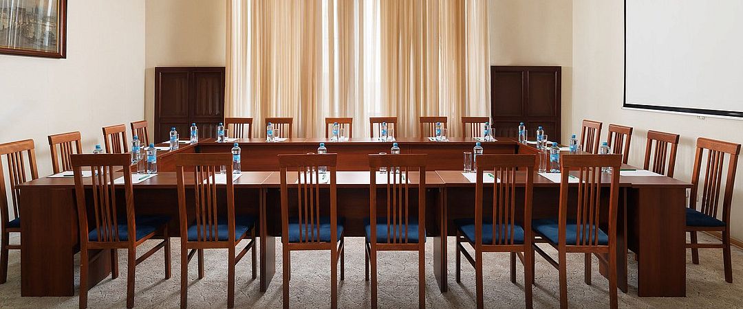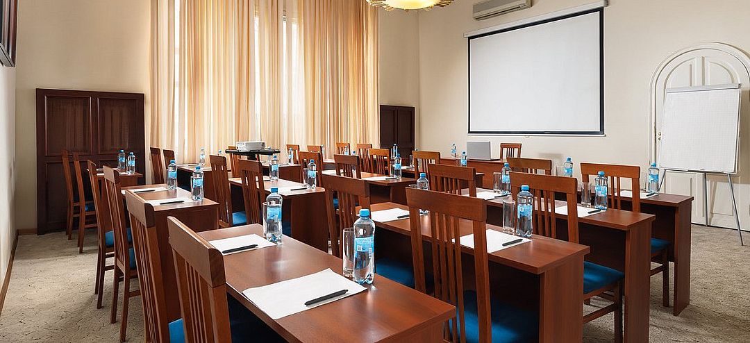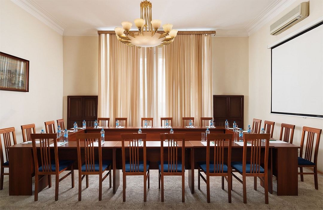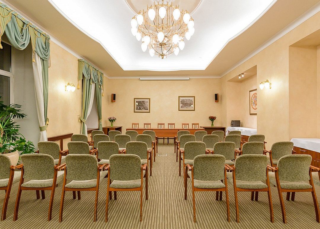 Элегантный конференц-зал в гостинице с классическим дизайном и нейтральной цветовой гаммой станет идеальным местом для проведения пресс-конференций и презентаций на аудиторию до шестидесяти человек. Удобная мебель, гармонично вписанная в интерьер, позволяет легко трансформировать пространство под любые задачи.