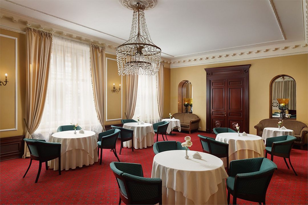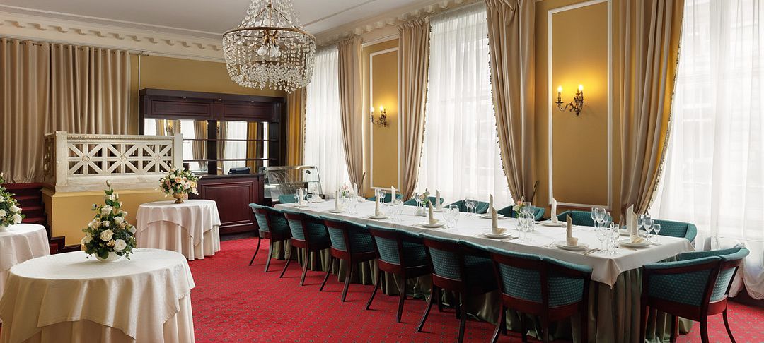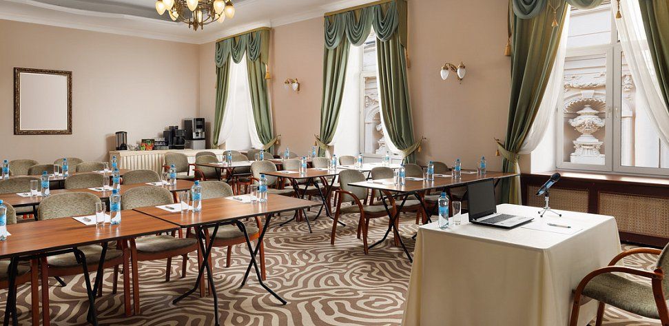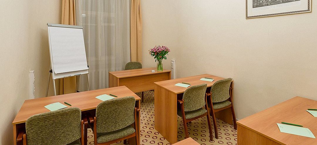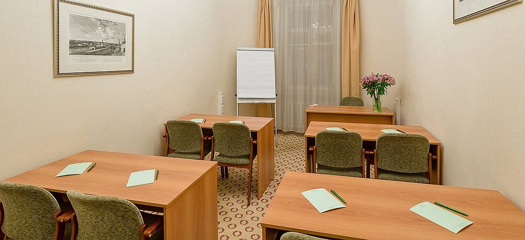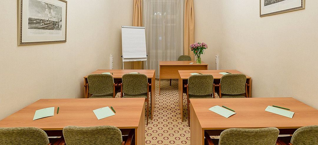 Элегантный конференц-зал в гостинице с классическим дизайном и нейтральной цветовой гаммой станет идеальным местом для проведения пресс-конференций и презентаций на аудиторию до шестидесяти человек. Удобная мебель, гармонично вписанная в интерьер, позволяет легко трансформировать пространство под любые задачи.
