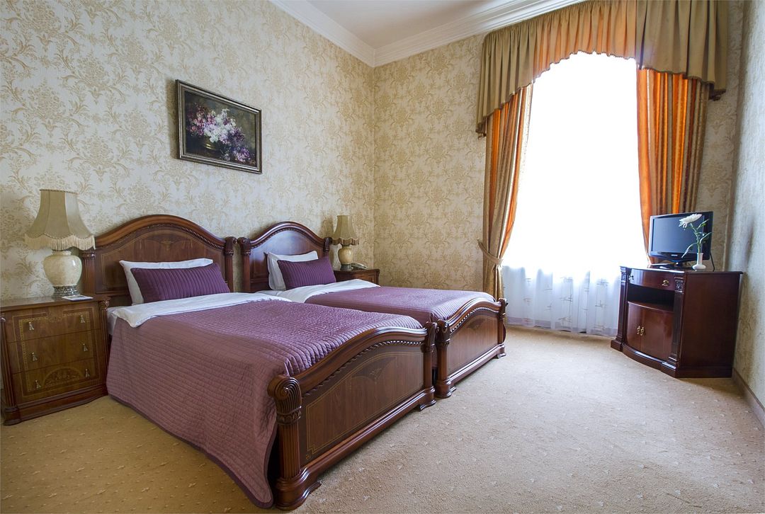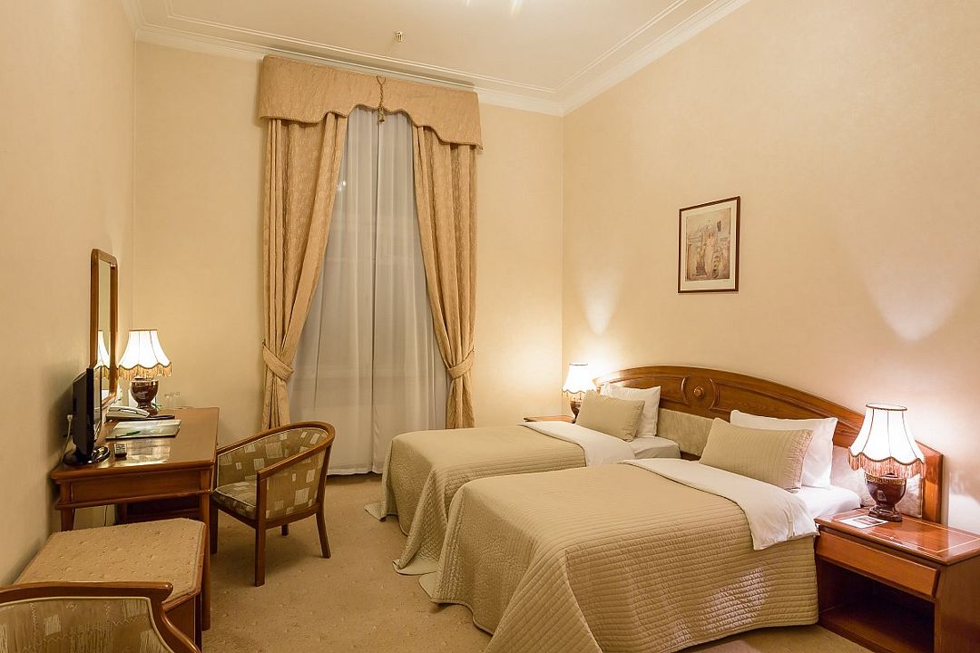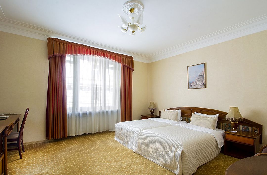 телевизор, Wi-Fi, холодильник, кондиционер, светильник, фен, ванная комната, банные полотенца, тапочки, косметические средства, две односпальные кровати, гипоаллергенное белье, тумбы, стулья, шкаф для одежды, вешалки, письменный стол, зеркало, письменные принадлежности, чайный набор, обслуживание номеров, сейф, чайник, унитаз, раковина, питьевая вода, ковровое покрытие, вид на город, высокие потолки, кресло-кровать, без питомцевВ гостиничном номере