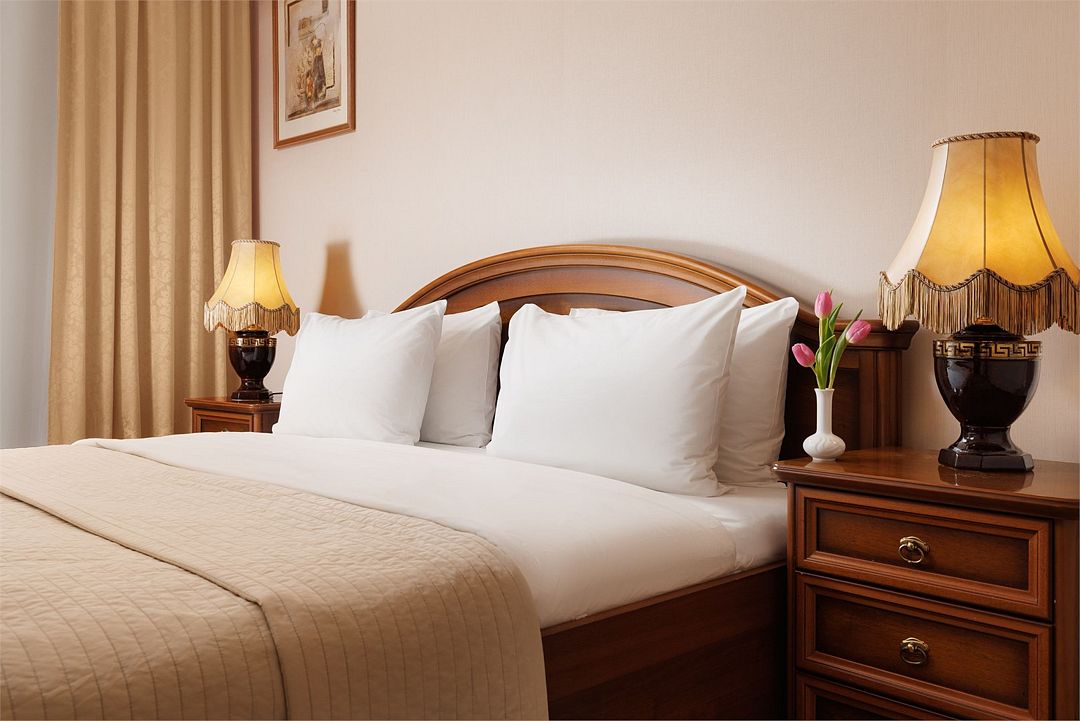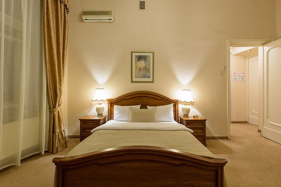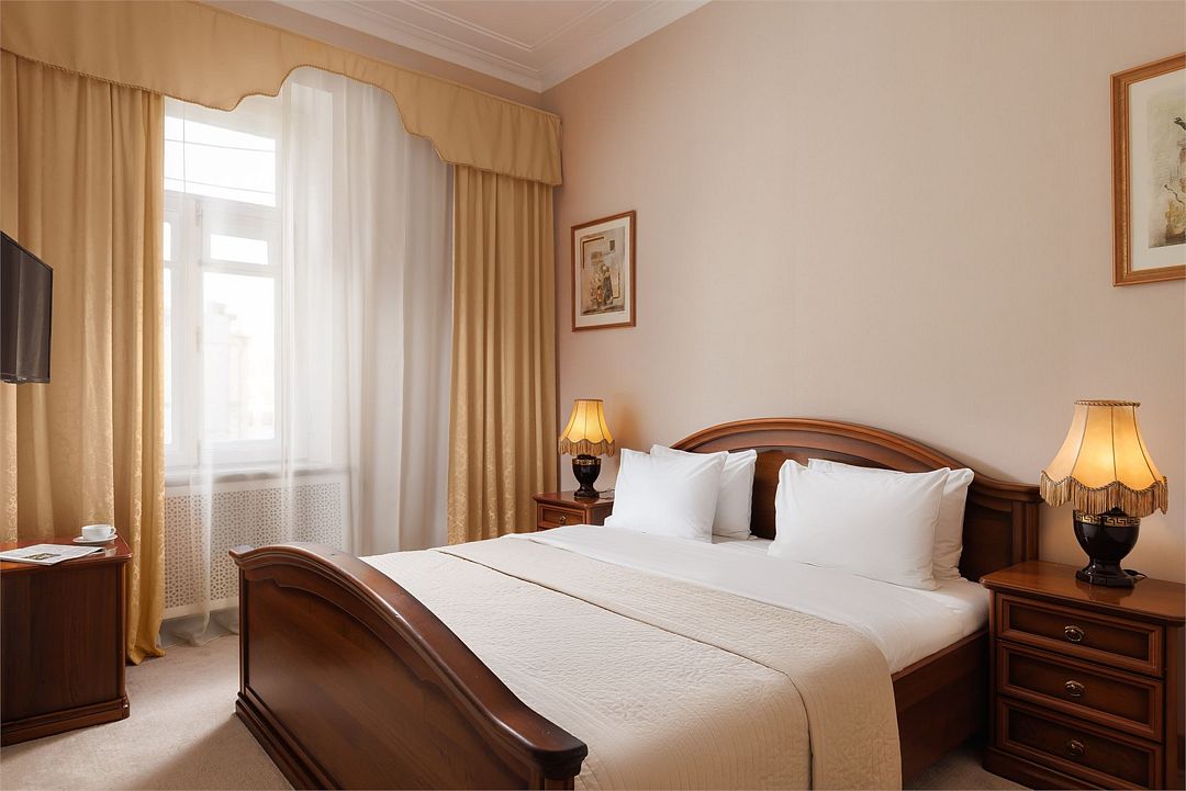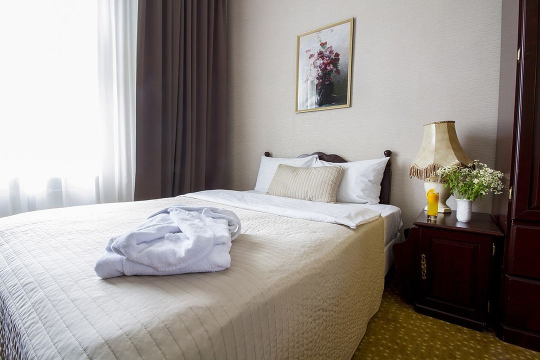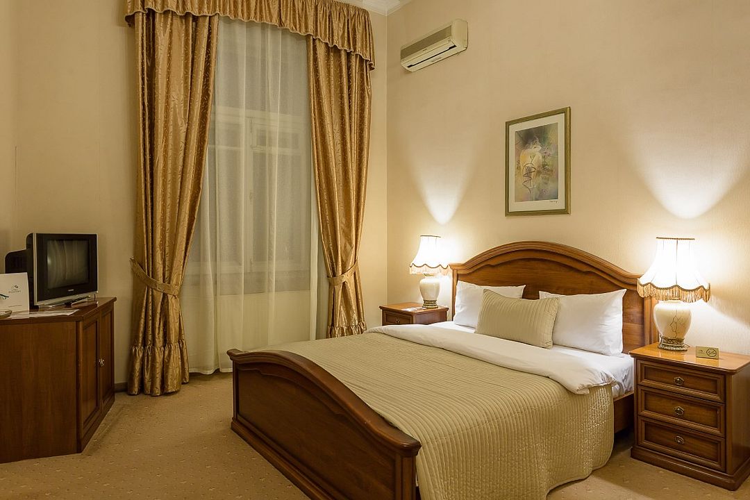 В номере: двуспальная кровать (160 см х 200 см), гипоаллергенное постельное белье, синтепоновая подушка, прикроватная тумба, шкаф для одежды, письменный стол, стул, телевизор, телефон, сейф, кондиционер, электрический чайник, Wi-Fi и возможность подключения к Интернету через выделенную линию. В ванной комнате: душевая кабина или ванна, туалет, косметические принадлежности, халат (по запросу), тапочки, фен. Каждый номер имеет индивидуальную планировку. Просьба уточнять при бронировании. Указанные тарифы приведены в рублях за номер в сутки, включая налоги, согласно законодательству, действующего на момент проживания. Общее количество номеров – 12. Площадь номера: 19 – 23 м2.Услуги и удобства