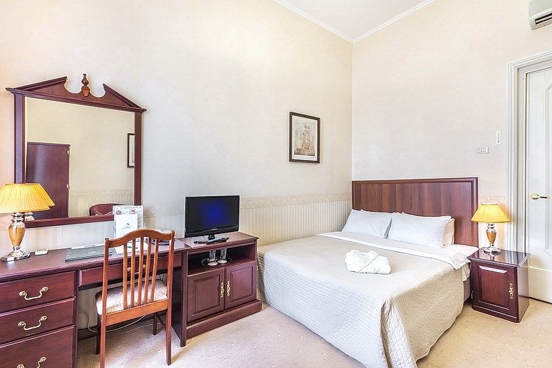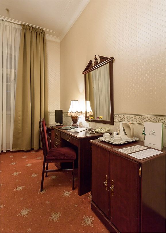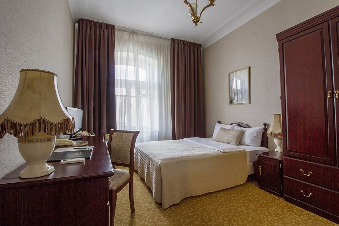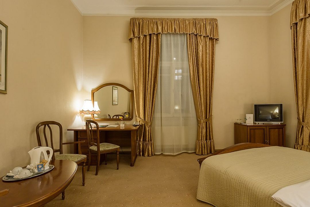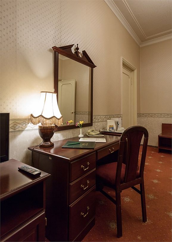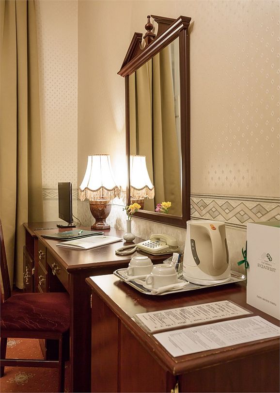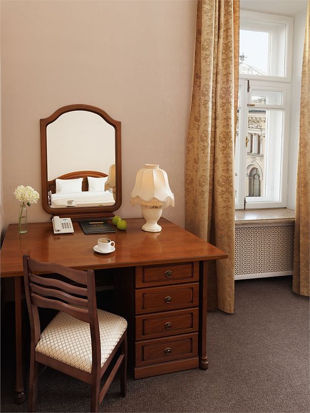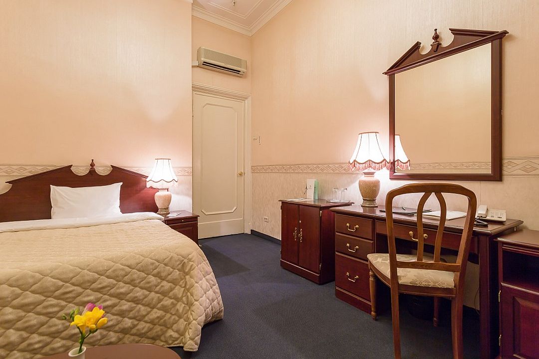 телевизор, Wi-Fi, холодильник, кондиционер, светильник, фен, ванная комната, банные полотенца, тапочки, косметические средства, односпальная кровать, гипоаллергенное белье, тумбы, стулья, шкаф для одежды, письменный стол, зеркало, письменные принадлежности, чайный набор, обслуживание номеров, сейф, чайник, унитаз, раковина, питьевая вода, ковровое покрытие, отопление, вид на город, вид во двор, высокие потолки, без питомцевВ гостиничном номере