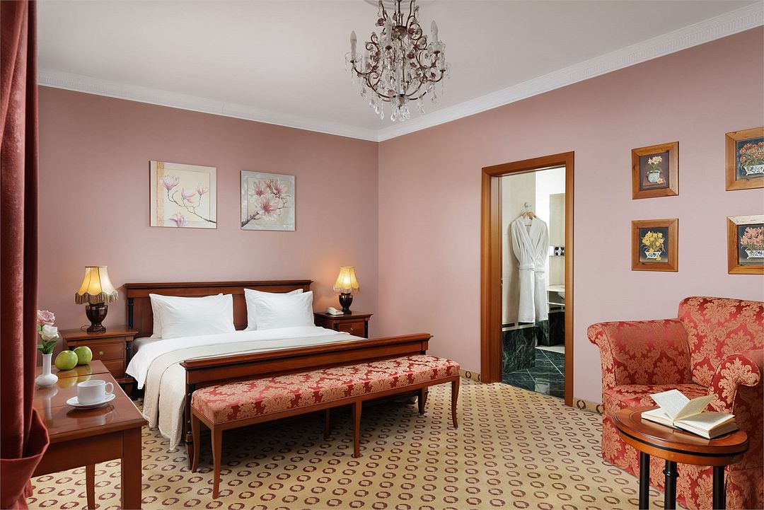 телевизор, Wi-Fi, холодильник, кондиционер, светильник, фен, ванная комната, халаты, банные полотенца, тапочки, косметические средства, кровать «King size», гипоаллергенное белье, диван, тумбы, стулья, шкаф для одежды, вешалки, журнальный столик, письменный стол, зеркало, две комнаты, письменные принадлежности, чайный набор, набор посуды, обслуживание номеров, сейф, чайник, унитаз, раковина, косметическое зеркало, питьевая вода, обеденная зона, гостиная зона, ковровое покрытие, вид на город, кресло, высокие потолки, стаканы, без питомцевВ гостиничном номере