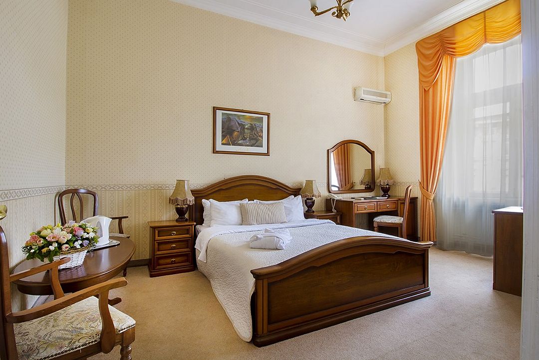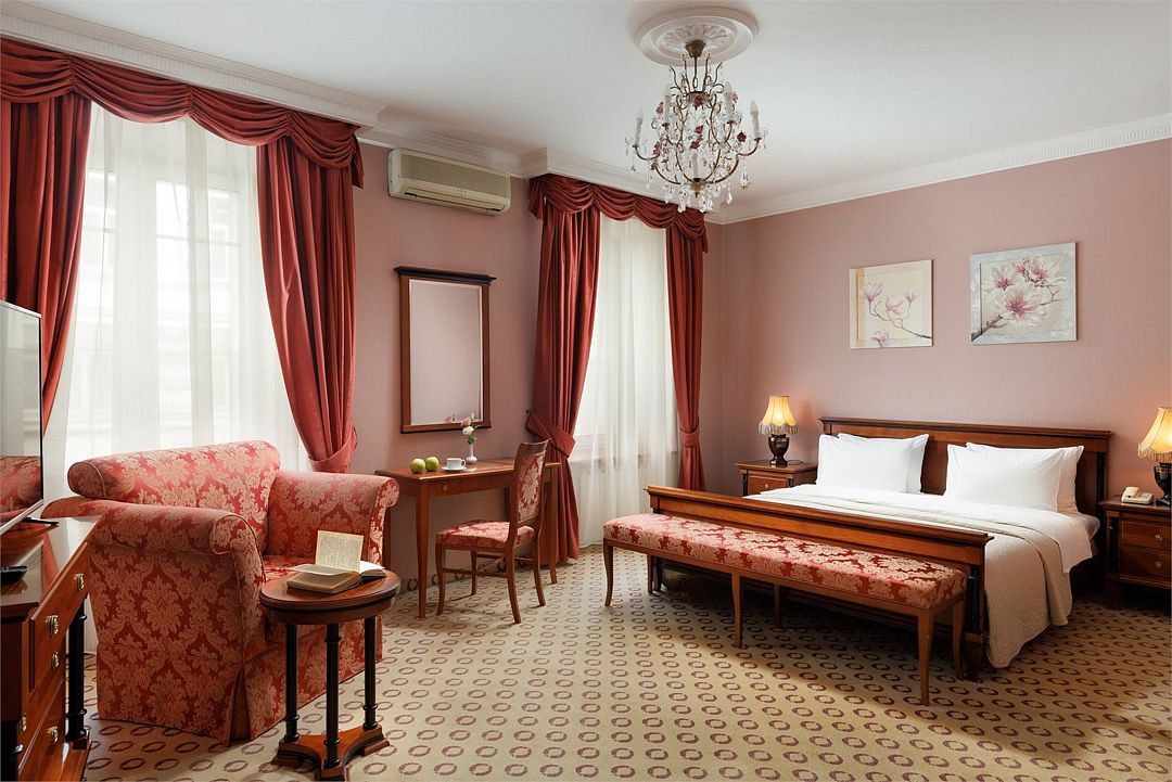 телевизор, Wi-Fi, холодильник, кондиционер, светильник, фен, ванная комната, банные полотенца, тапочки, косметические средства, двуспальная кровать, гипоаллергенное белье, тумбы, стулья, шкаф для одежды, письменный стол, зеркало, письменные принадлежности, чайный набор, обслуживание номеров, сейф, чайник, унитаз, раковина, питьевая вода, ковровое покрытие, вид на город, вид во двор, высокие потолки, стаканы, без питомцевВ гостиничном номере