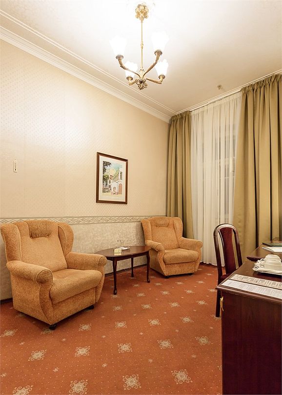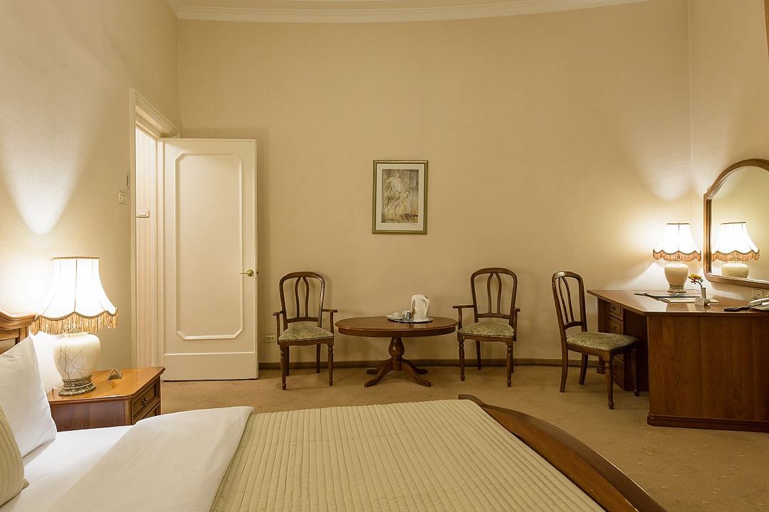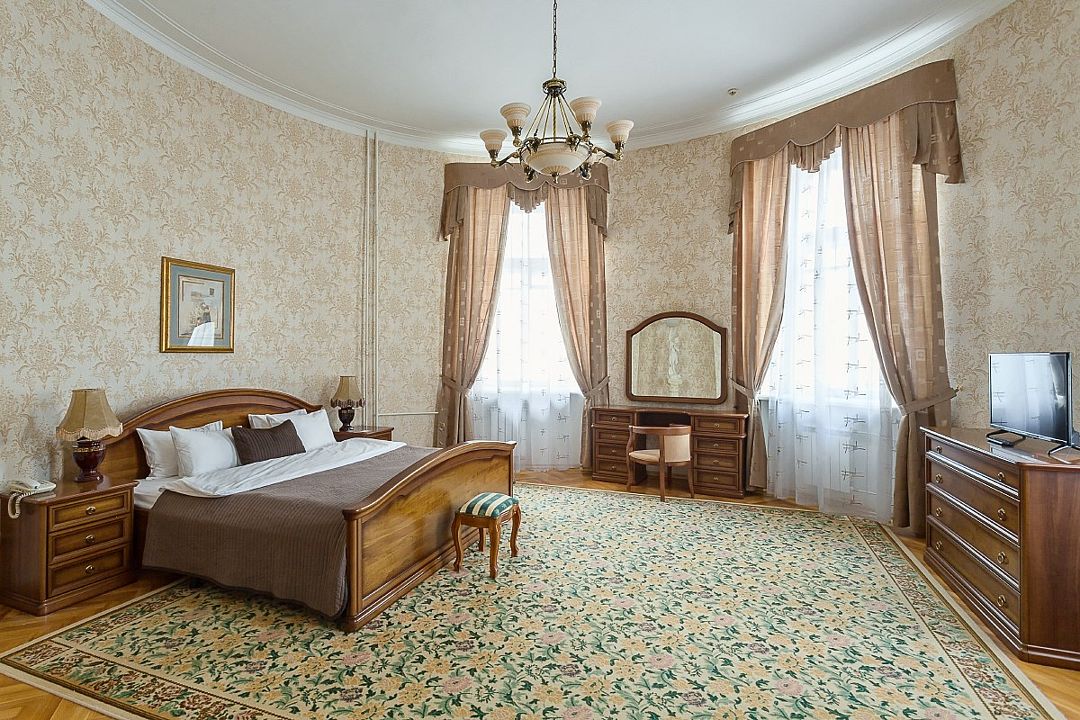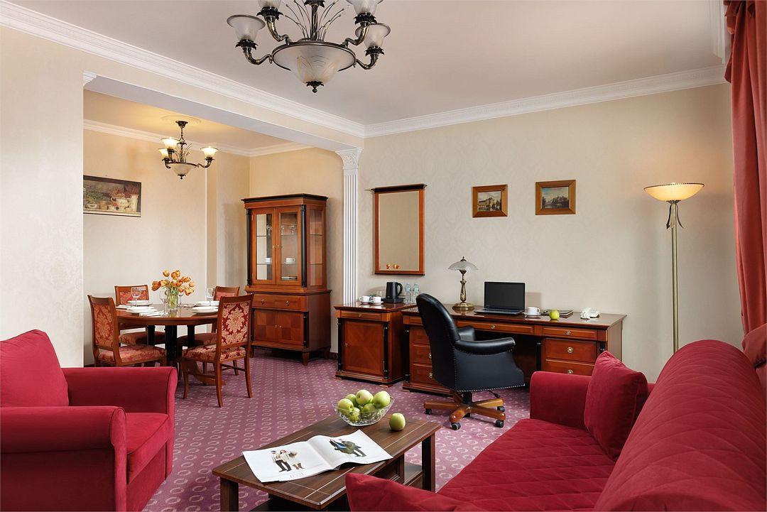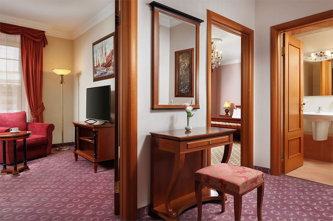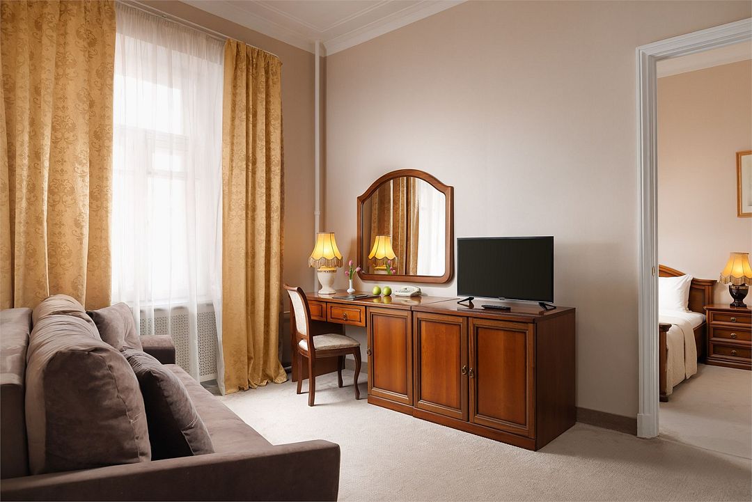 Спальная комната: двуспальная кровать king-size (190 х 200 см или две односпальные кровати twin (100 х 200 см), гипоаллергенное постельное белье, синтепоновая подушка, прикроватные тумбы, подставка под чемодан, шкаф для одежды, туалетный столик, стул. Гостиная комната: круглый стол, стулья, буфет с посудой, 2 кресла, журнальный стол, рабочий стол. Ванная комната: ванна, косметические принадлежности, фен, халат, тапочки, 2 туалета. Техническое оснащение номера: 2 телевизора, телефон, сейф, кондиционер, электрический чайник (чай, кофе, сливки), Wi-Fi и возможность подключения к Интернету через выделенную линию. Каждый номер имеет индивидуальную планировку. Просьба уточнять при бронировании. Указанные тарифы приведены в рублях за номер в сутки, включая налоги, согласно законодательству, действующего на момент проживания. Общее количество номеров – 5. Площадь номера: 69 - 70 м2.Услуги и удобства