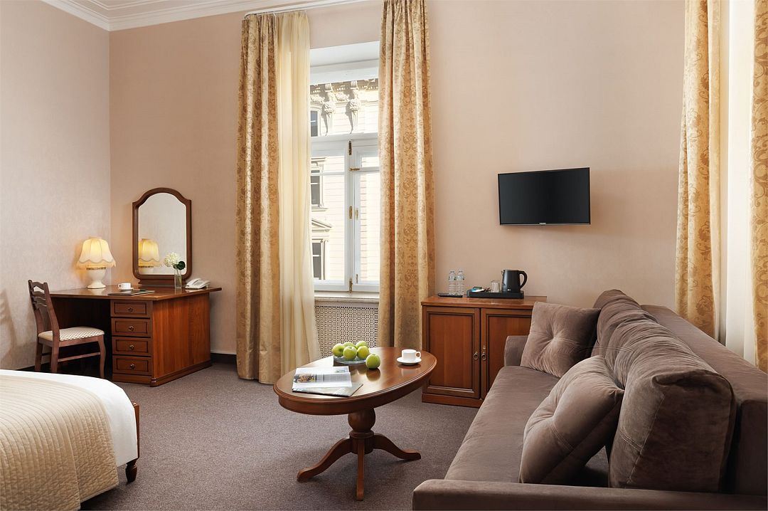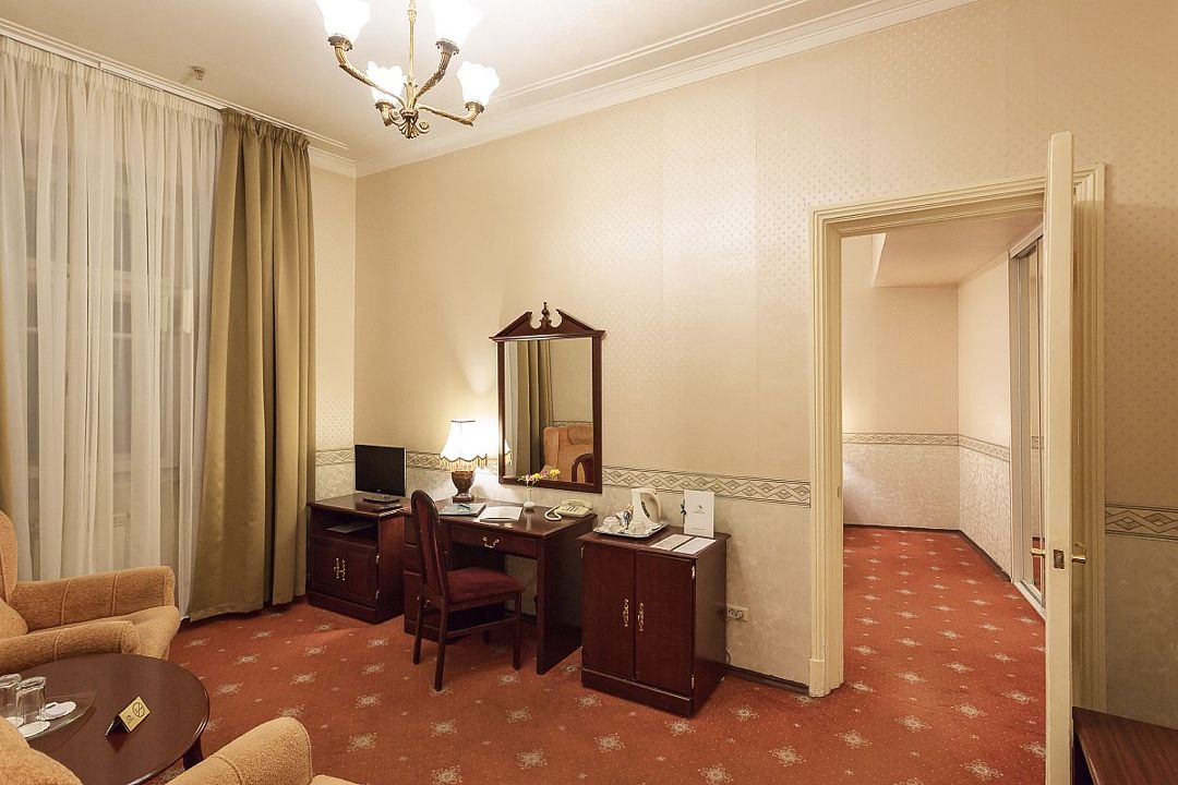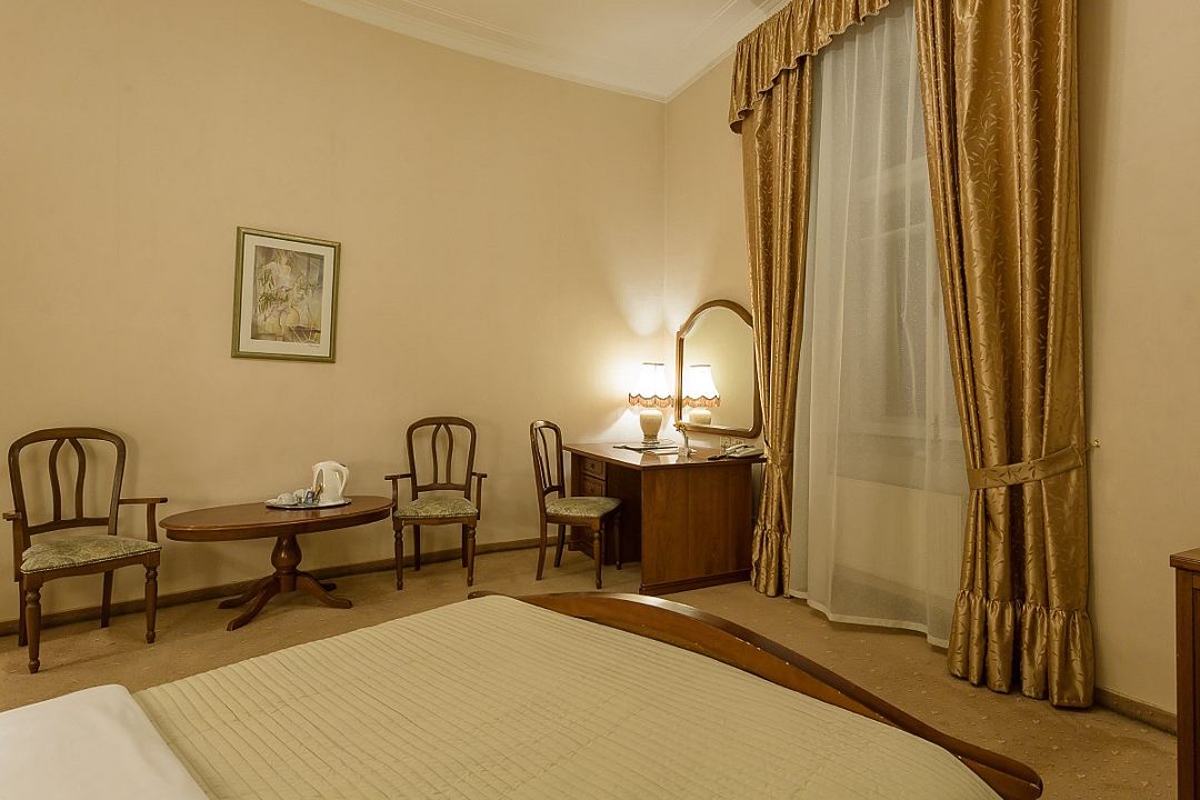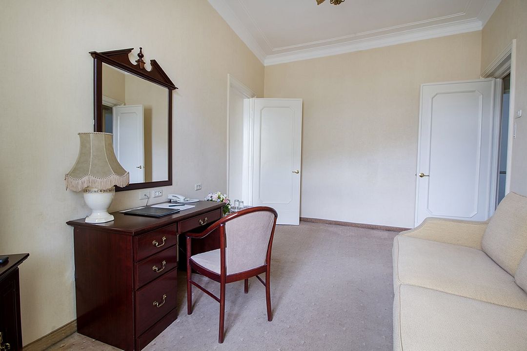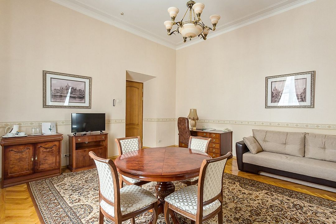 Спальная комната: двуспальная кровать king-size (190 х 200 см или две односпальные кровати twin (100 х 200 см), гипоаллергенное постельное белье, синтепоновая подушка, прикроватные тумбы, подставка под чемодан, шкаф для одежды, туалетный столик, стул. Гостиная комната: круглый стол, стулья, буфет с посудой, 2 кресла, журнальный стол, рабочий стол. Ванная комната: ванна, косметические принадлежности, фен, халат, тапочки, 2 туалета. Техническое оснащение номера: 2 телевизора, телефон, сейф, кондиционер, электрический чайник (чай, кофе, сливки), Wi-Fi и возможность подключения к Интернету через выделенную линию. Каждый номер имеет индивидуальную планировку. Просьба уточнять при бронировании. Указанные тарифы приведены в рублях за номер в сутки, включая налоги, согласно законодательству, действующего на момент проживания. Общее количество номеров – 5. Площадь номера: 69 - 70 м2.Услуги и удобства