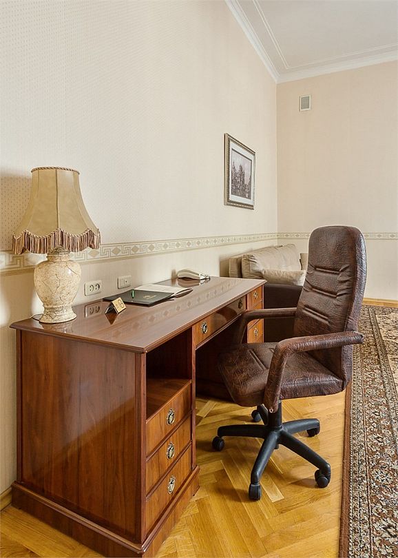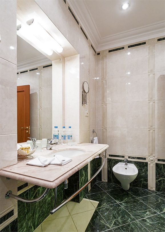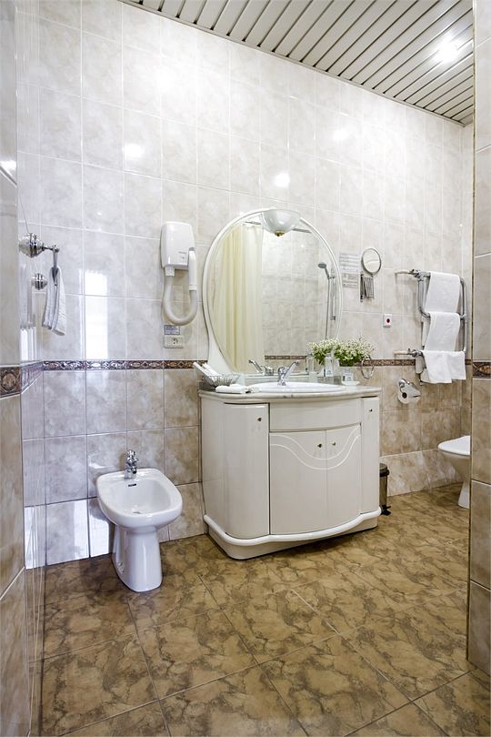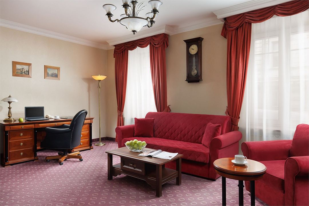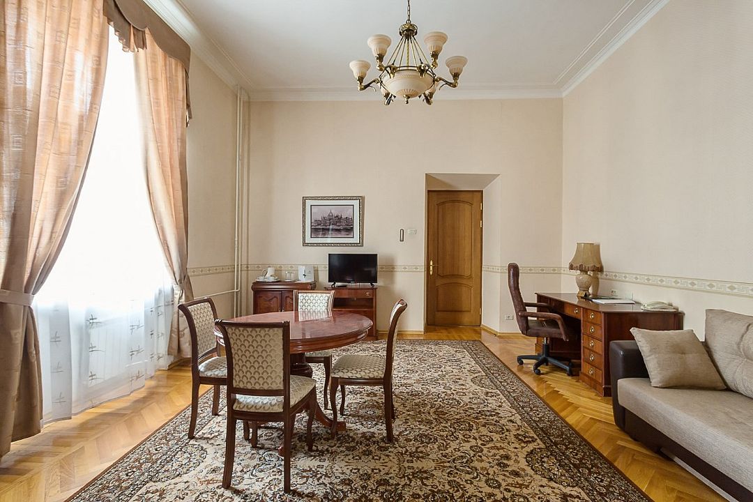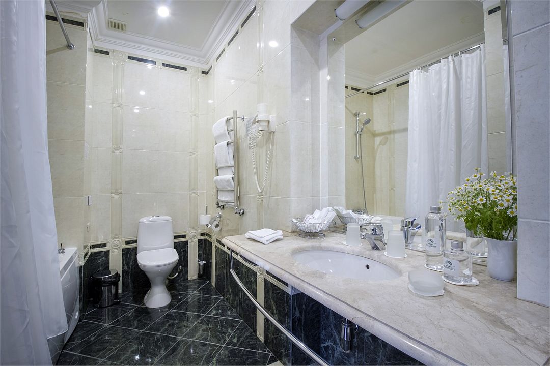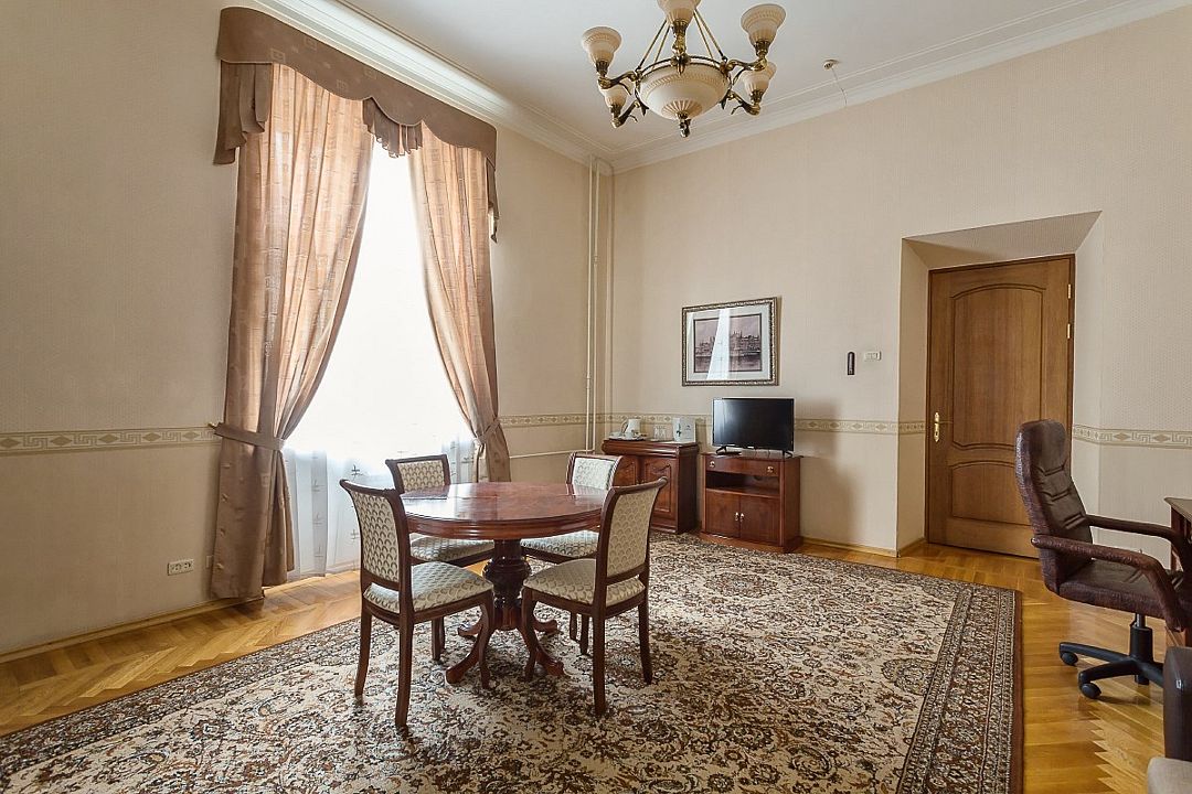 Спальная комната: двуспальная кровать king-size (190 х 200 см или две односпальные кровати twin (100 х 200 см), гипоаллергенное постельное белье, синтепоновая подушка, прикроватные тумбы, подставка под чемодан, шкаф для одежды, туалетный столик, стул. Гостиная комната: круглый стол, стулья, буфет с посудой, 2 кресла, журнальный стол, рабочий стол. Ванная комната: ванна, косметические принадлежности, фен, халат, тапочки, 2 туалета. Техническое оснащение номера: 2 телевизора, телефон, сейф, кондиционер, электрический чайник (чай, кофе, сливки), Wi-Fi и возможность подключения к Интернету через выделенную линию. Каждый номер имеет индивидуальную планировку. Просьба уточнять при бронировании. Указанные тарифы приведены в рублях за номер в сутки, включая налоги, согласно законодательству, действующего на момент проживания. Общее количество номеров – 5. Площадь номера: 69 - 70 м2.Услуги и удобства
