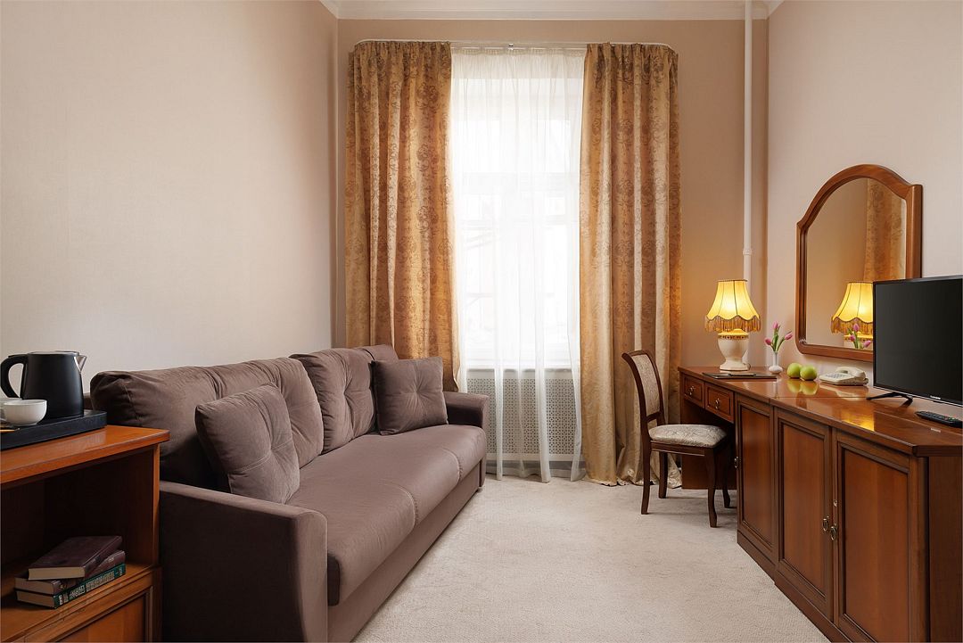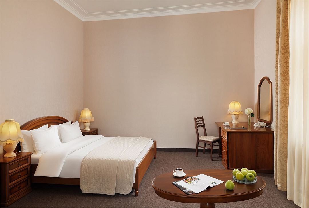 В номере: односпальная кровать (120 см х 200 см), гипоаллергенное постельное белье, синтепоновая подушка, прикроватная тумба, письменный стол, стул, телевизор, телефон, сейф, кондиционер, электрический чайник, Wi-Fi и возможность подключения к Интернету через выделенную линию. В ванной комнате: душевая кабина или ванна, туалет, косметические принадлежности, халат (по запросу), тапочки, фен. Каждый номер имеет индивидуальную планировку. Просьба уточнять при бронировании. Указанные тарифы приведены в рублях за номер в сутки, включая налоги, согласно законодательству, действующего на момент проживания. Общее количество номеров – 36. Площадь номера: 15 – 20 м2.Услуги и удобства
