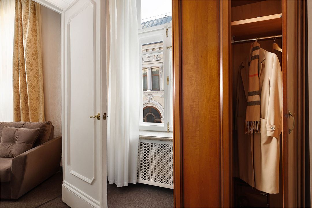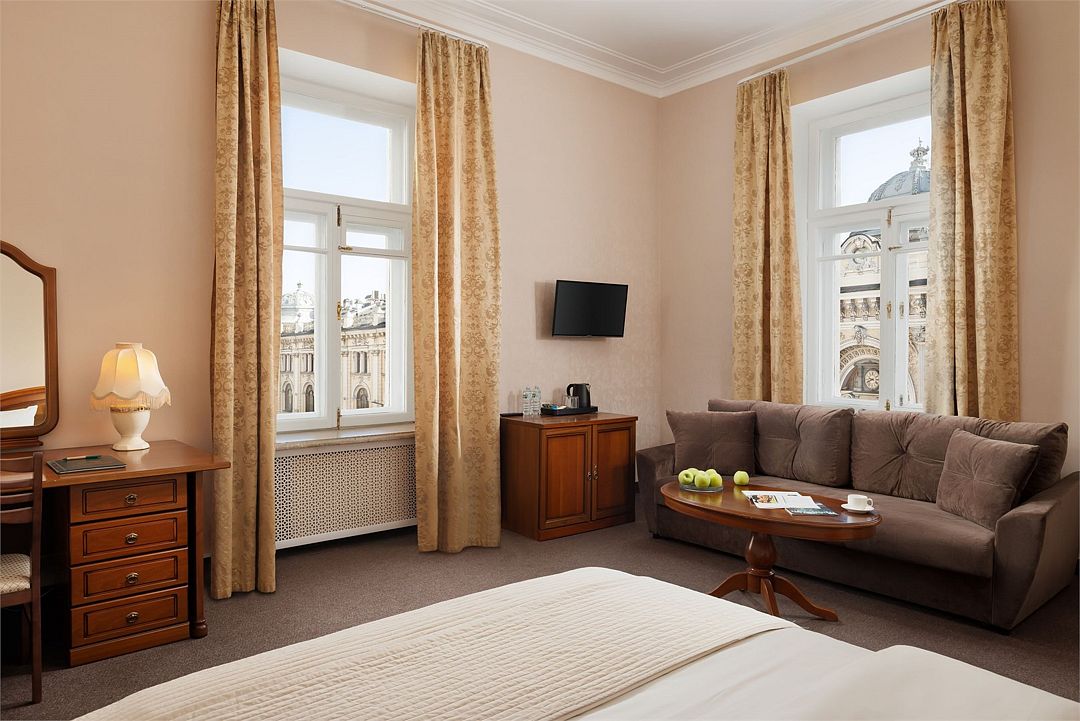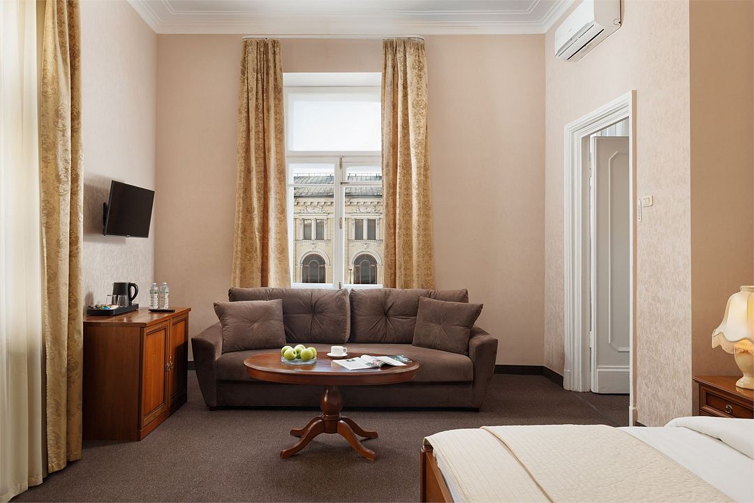 телевизор, Wi-Fi, холодильник, кондиционер, светильник, фен, ванная комната, халаты, тапочки, косметические средства, две односпальные или большая двуспальная кровать, гипоаллергенное белье, диван, тумбы, стулья, шкаф для одежды, вешалки, журнальный столик, письменный стол, зеркало, письменные принадлежности, чайный набор, обслуживание номеров, сейф, чайник, унитаз, раковина, питьевая вода, гостиная зона, ковровое покрытие, вид на город, высокие потолки, стаканы, без питомцевВ гостиничном номере
